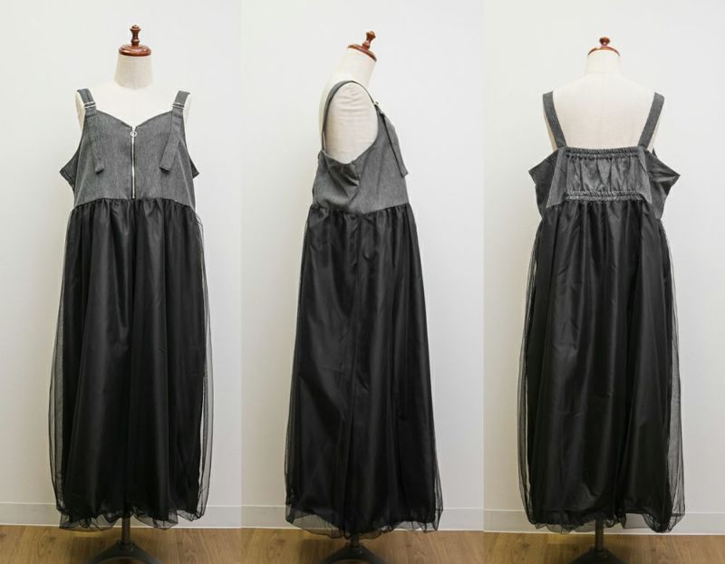 3Lサイズを着用して、バストやウエスト周りもちょうどよく、バルーンシルエットでラインを拾わず楽な着心地でした◎フロントのジップがアクセントになっていて、甘さの中にもモード感をプラスしてくれます♪チュール切替のスカート部分はふんわり広がって、気になるヒップや太ももをしっかりカバー。デザイン性がありながらも1枚でさらっと着られるワンピースなので、コーデに迷わない優秀アイテムです♪スニーカーを合わせてカジュアルに着崩すのもおすすめです!インナー次第で雰囲気や季節感も変えて楽しめるワンピースです。