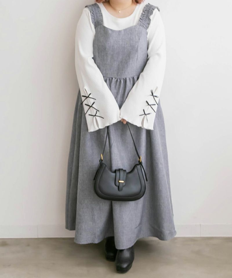 3Lサイズを着てちょうどいいサイズでした。フィットしすぎないけどすっきりときこなせる、シンプルなのに可愛さのあるデザインです♪肩ひもはギャザーを寄せたフリル調になっていて、ウエスト切替でしっかりとフレアに広がるシルエットが女性らしいです◎無地のシンプルな形だから、柄のインナーと合わせてもいいし、夏はTシャツ、冬はニットと合わせたりして通年着まわせます!大人可愛い雰囲気にまとまるワンピースです!