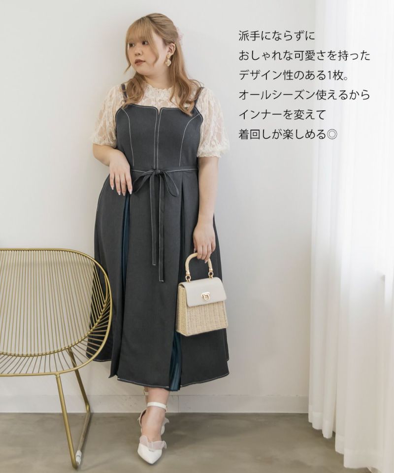 3Lを着てちょうどいいサイズでした。フィット&フレアシルエットで、配色ステッチやウエストリボン、プリーツ切替の縦長効果で着やせ効果の高いデザインです!着心地も窮屈感はまりません◎プリーツは動くと見えるような感じで、派手にならずにアクセントになっています。胸元のV切替もさりげないけど可愛いです♪