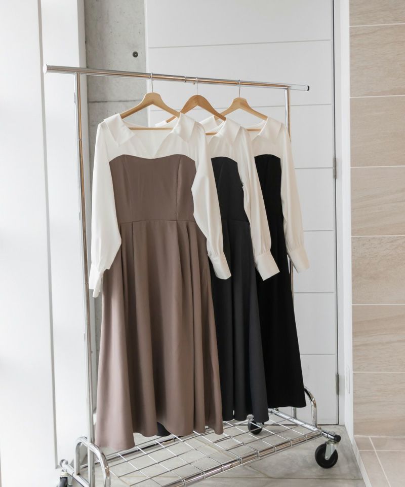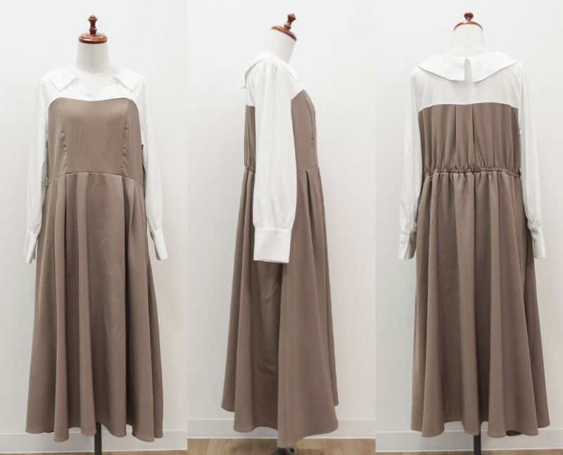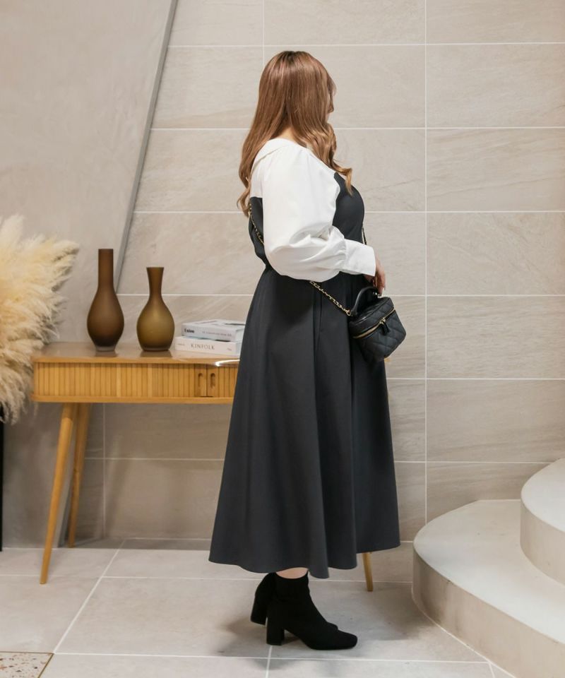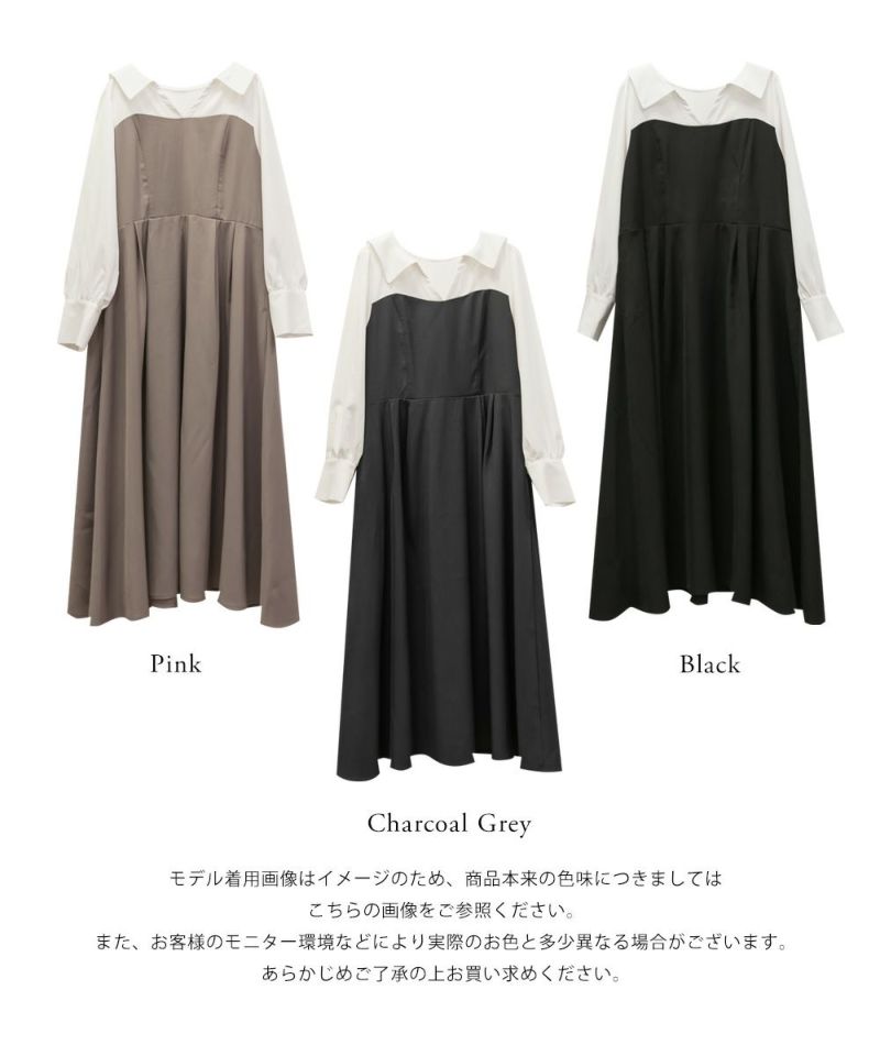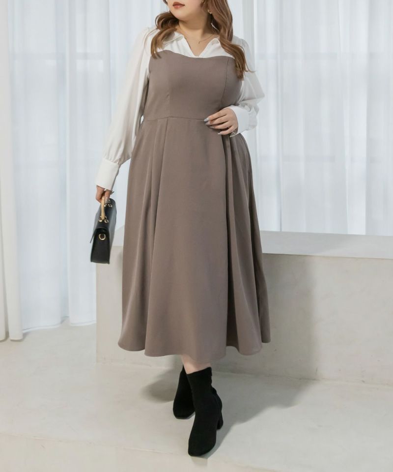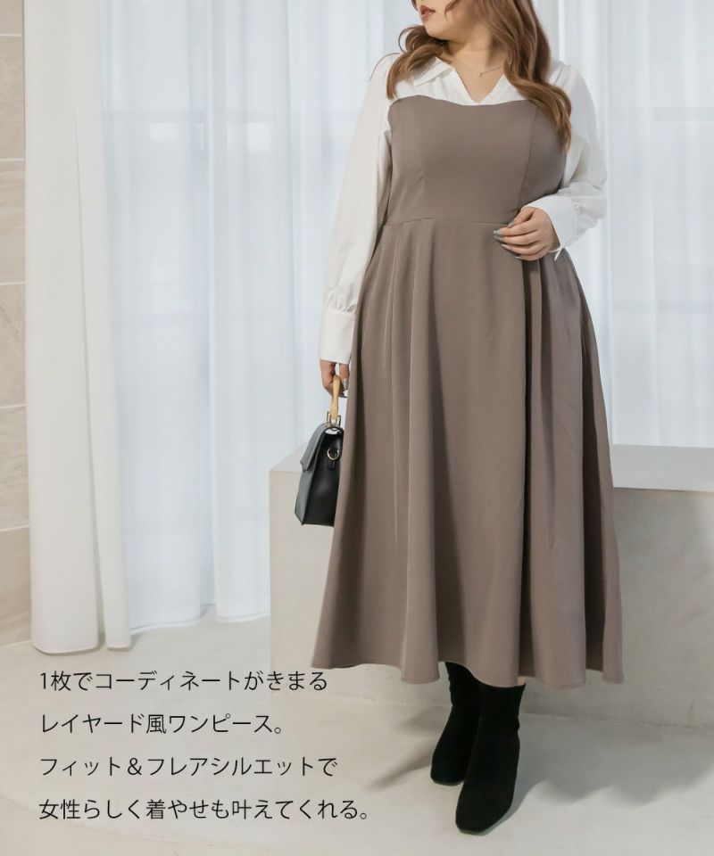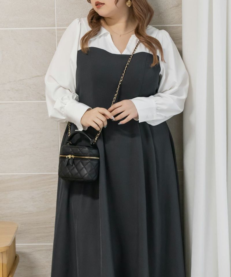 クレット ぽっちゃり 大きいサイズ ロングワンピース デート ビスチェワンピース シャツワンピース 着やせ CLETTEオリジナル★シャツレイヤード風ドッキングワンピース