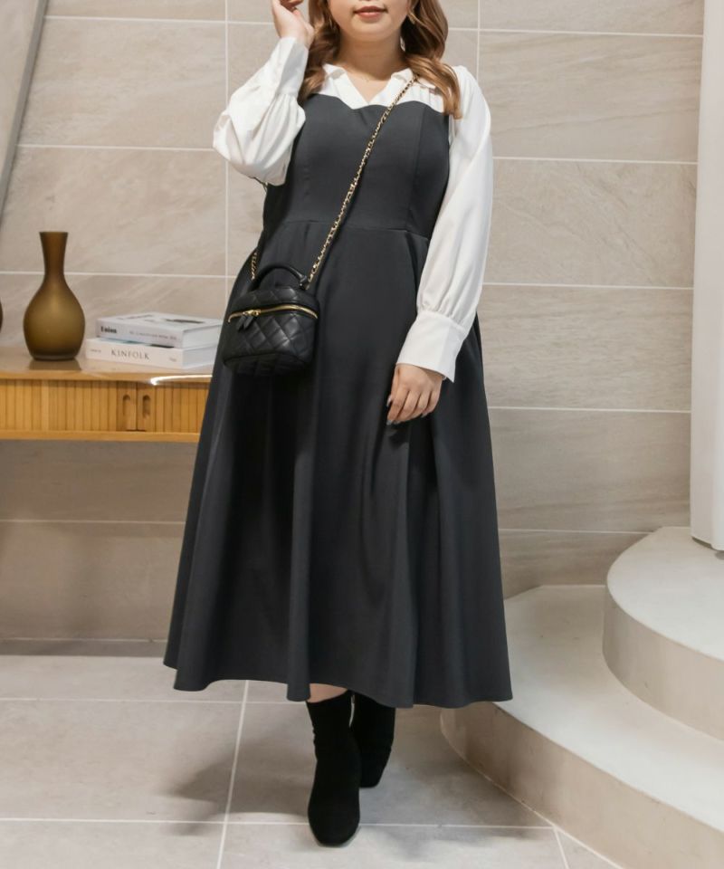3Lを着て丁度いいサイズでした。シャツをベアワンピに重ね着してる風のデザインだから、1枚でコーディネートしてる雰囲気になれるお得感のあるデザインです◎襟デザインが大人っぽくて、しかも綺麗に開いているから顔回りもすっきりした印象になれるのが嬉しいです!シンプルで大人っぽく着用できるので色々なシーンで使えそうなワンピースです♪