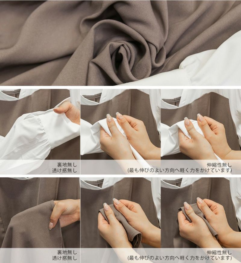 裏地・透け感・伸縮性 シャツ部分:裏地無し、透け感わずかに有り、伸縮性無し / 本体:裏地無し、透け感無し、伸縮性無し