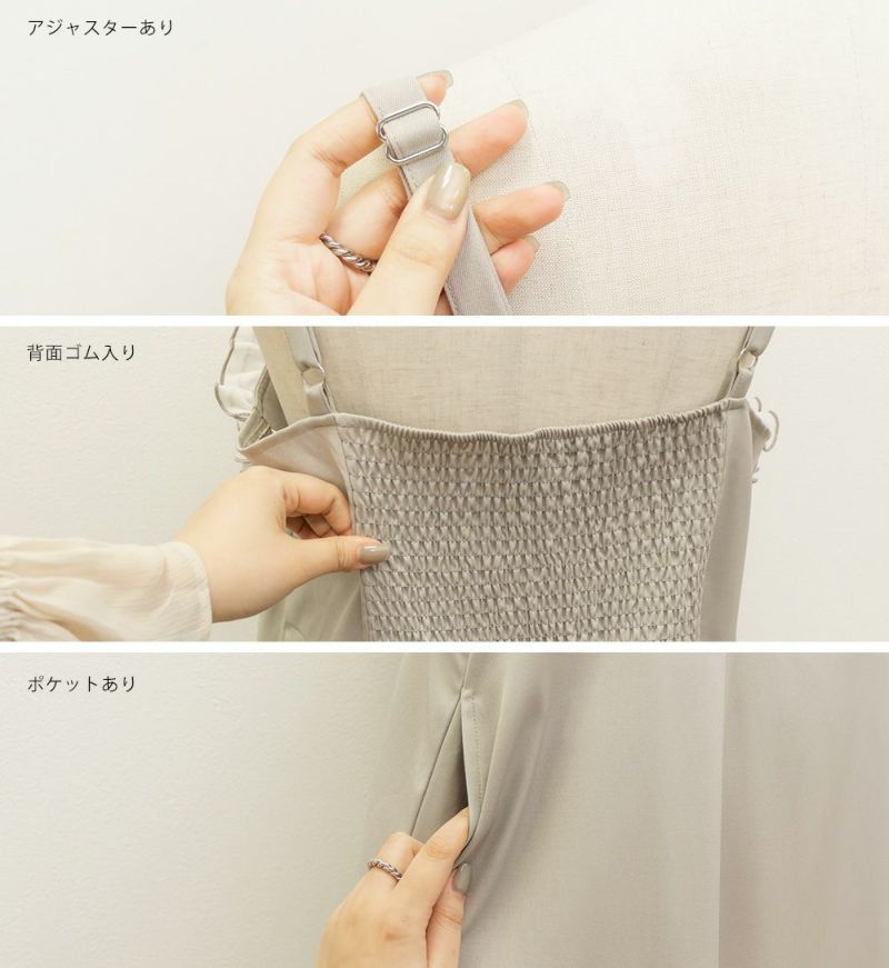 3Lを着て、ちょうどいいサイズ感でした。いつも通りの着心地です。ウエストに切替が無いすっきりしたシルエットなのに、キュッと締まって見えるデザインでとってもきれいでした◎胸元のフリルが他にないデザインで、春夏のシンプルな装いに可愛いアクセントをプラスしてくれます。華奢なシルエットだけど、窮屈感が無く、視覚効果でスタイルアップして見えるのが嬉しいポイントです♪肩ひもで長さが調整できるから、自分の体型に合わせてバランスを取れるのも◎さらっとした素材感も快適でした!インナー次第でロングシーズン使えそうなので、着回しが楽しみです♪