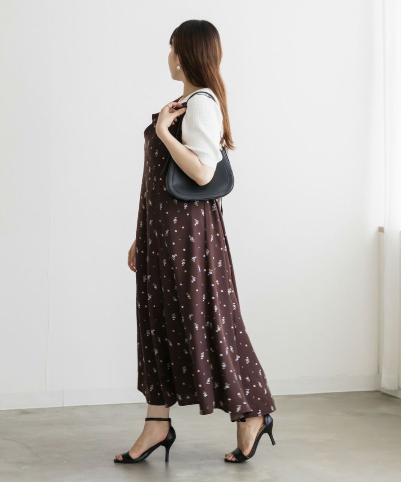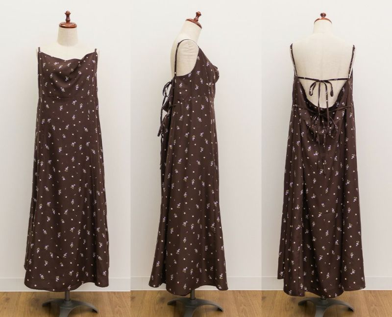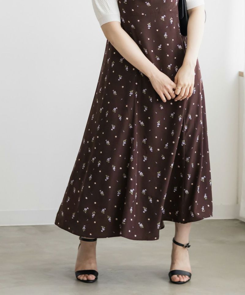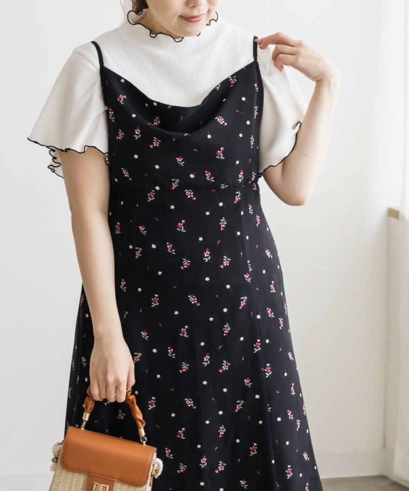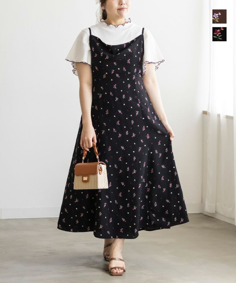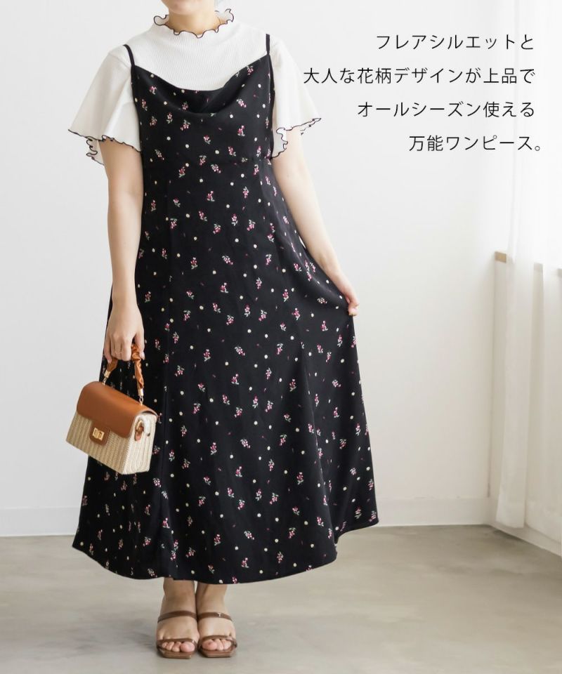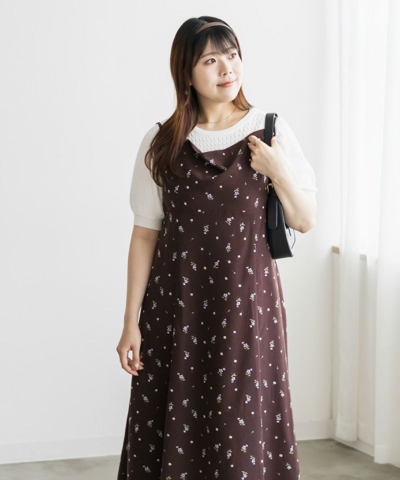 3Lサイズを着用して、ウエストやヒップまわりまでゆとりがあり、背中とウエストは紐で調節するので、自分好みのサイズ感で着用出来ました。ゴムが入っていないので、心配な方はサイズ確認をお勧めします!すっきりしたシルエットだけどパネル切替でラインを拾わずリラクシーな着心地でした◎胸元と背中はのドレープデザインになっていて女性らしい印象で、繊細な花柄と相まって、着るだけで華やか見えが叶います♪肩紐はアジャスター付きで調節可能なので、インナーや合わせるトップスによってバランスが取りやすく、好みの着丈に合わせやすいのも嬉しいポイント。裏地付きで透け感も気にならず、1枚でさらっと着られるのも◎Tシャツやシアートップスとレイヤードして、春夏らしい軽やかなスタイリングがおすすめ!ロングシーズン着回しできるのも嬉しいです。