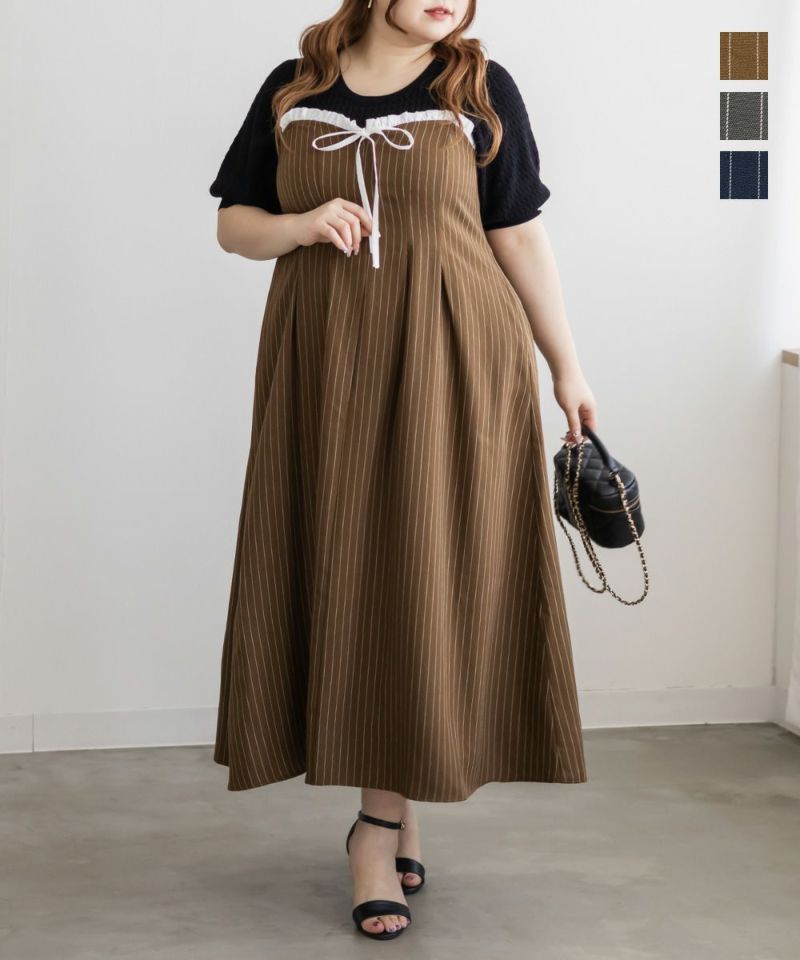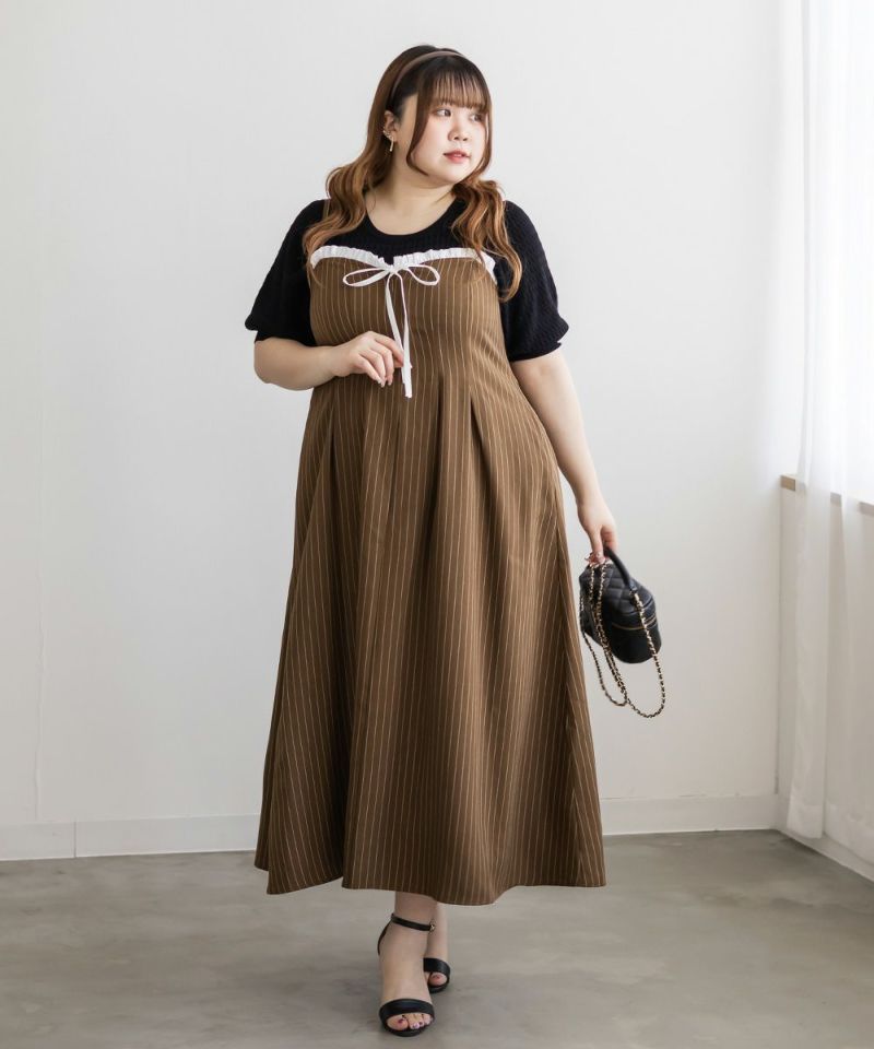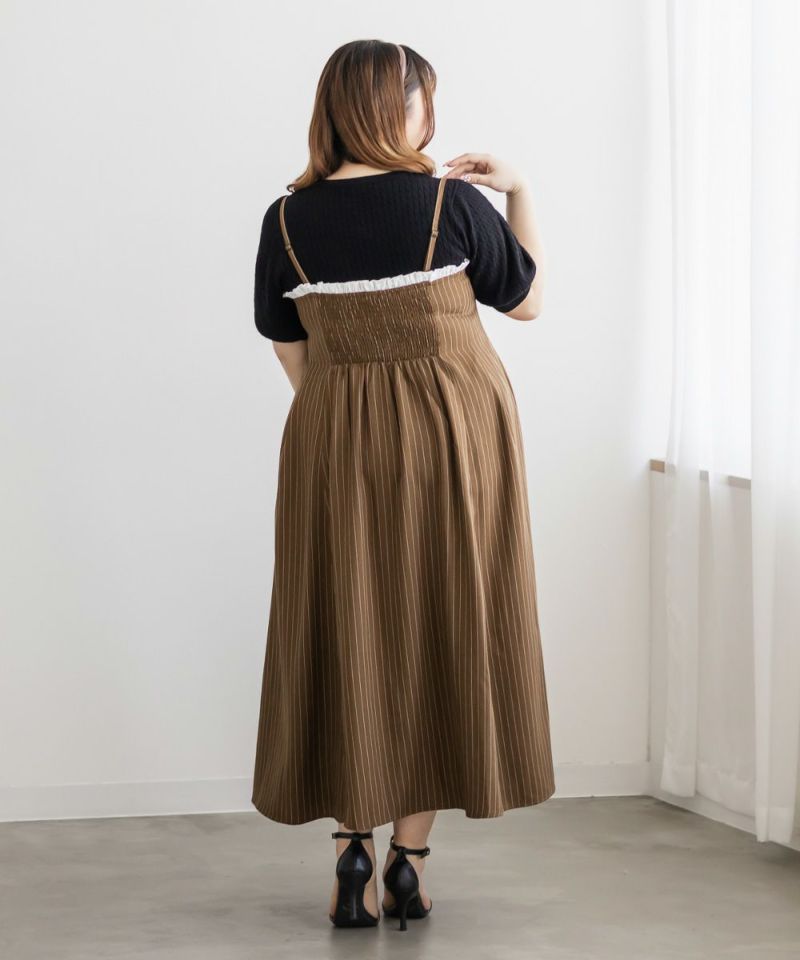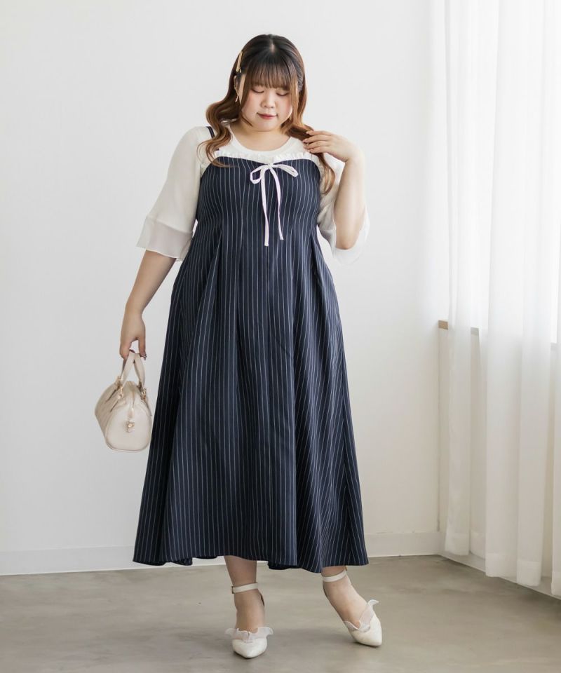 3Lを着て、見頃なども丁度良くすっきり綺麗に着用出来ました。後ろはゴムなので、フィット感がありながら窮屈感はなかったです!ウエスト部分にタックがたっぷり入っていてお腹周りもすっきりカバーしてくれます!すらっとしたシルエットながら、しっかりボディラインをカバーしてくれるディティールでした。ストライプ×リボン×フリルのときめき要素が詰まったキャミワンピで、アジャスター付きで肩紐の長さを調整できるので、バスト位置もちょうどよく着られました。Tシャツやブラウスを合わせて甘めに、シンプルなトップスでカジュアルに、着回し力も抜群の一枚です◎