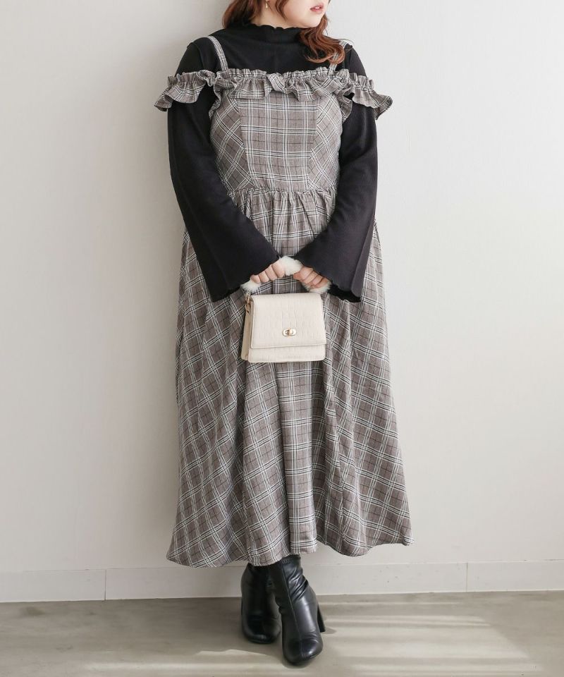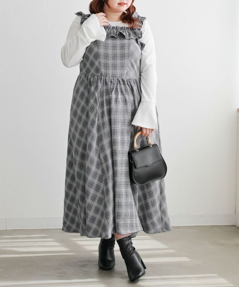 3Lサイズを着用しましたが、ちょうどいいサイズ感です。さらりとした生地で着心地が軽く、長時間着ても快適そうです◎フリルが顔まわりを華やかに見せてくれ、ウエストの切替デザインがスタイルをすっきり見せてくれます。肩紐のフリルは2WAY仕様で、フリルを下げて着ると抜け感が出てすっきりメリハリのある印象でしかも可愛いです!!チェック柄が今っぽくて、オールシーズン使えるのがうれしいポイントです!
