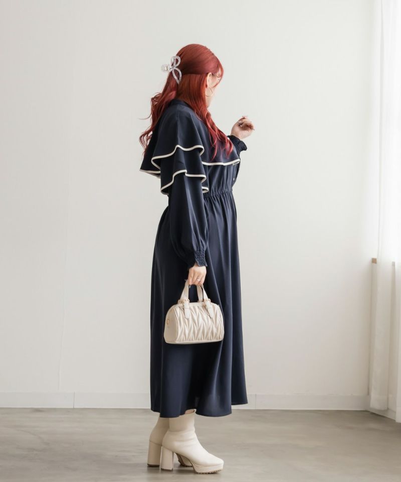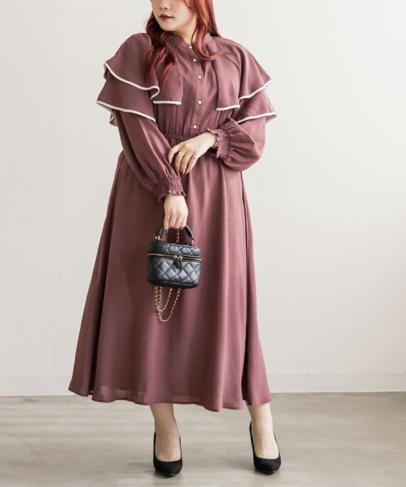 3Lサイズを着用してちょうどいいサイズ感でした◎ウエストもやわらかいゴム入りだったのでストレスなく着用出来ました!メリハリのある配色テープのデザインでがお出かけやデートにピッタリです♪フリルが見頃をコンパクトに魅せてくれて、フェミニンさと着痩せを両立した1枚です。アウターを着てもごわつかない軽い生地感でした。秋~春と長いシーズン着れそうなワンピです!