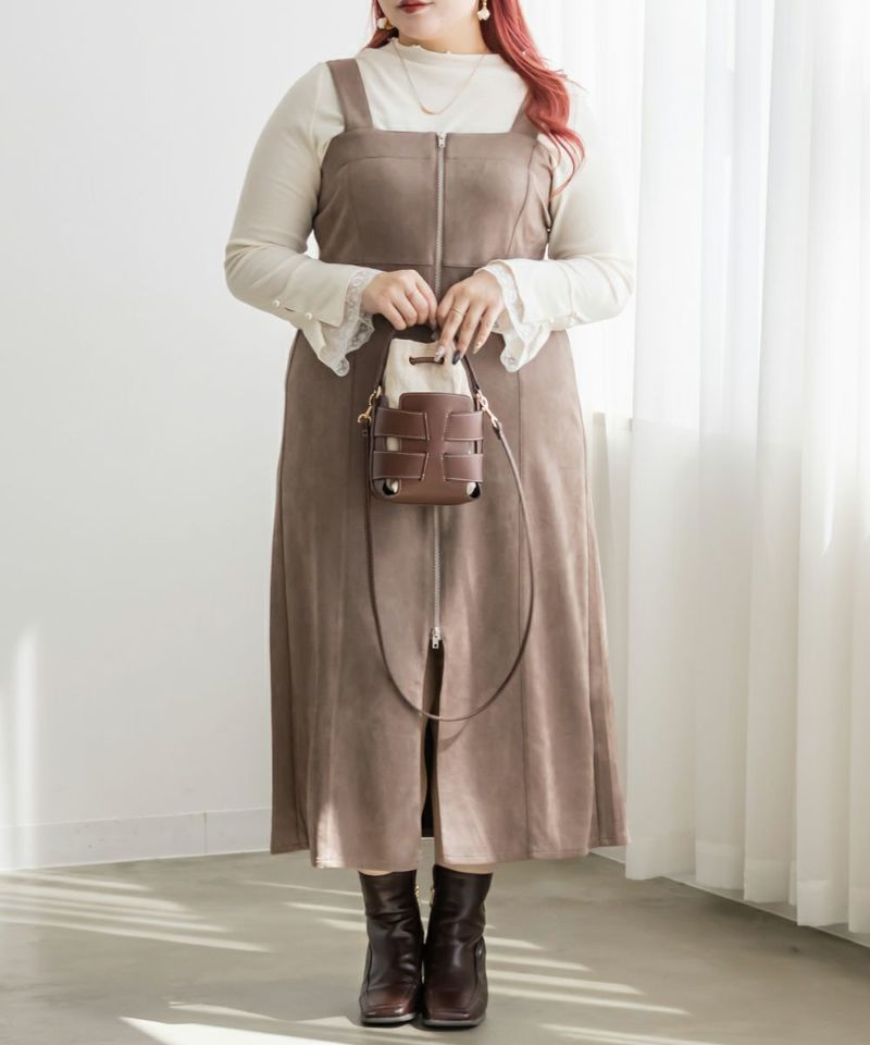 3Lサイズを着用してピッタリのサイズ感でした。やわらかいスエード調の生地で着心地ラクチンでした◎切り替え位置が高めなのでスタイルアップしてすっきりした印象で着ることができました!真ん中ジップデザインが縦のラインを強調してくれるのもポイントです!Iラインのワンピースだけど、タイト過ぎないシルエットなので、ボディラインも拾いにくいのが嬉しいです。インナー次第で様々な雰囲気になれるのでたくさん着回しできます♪