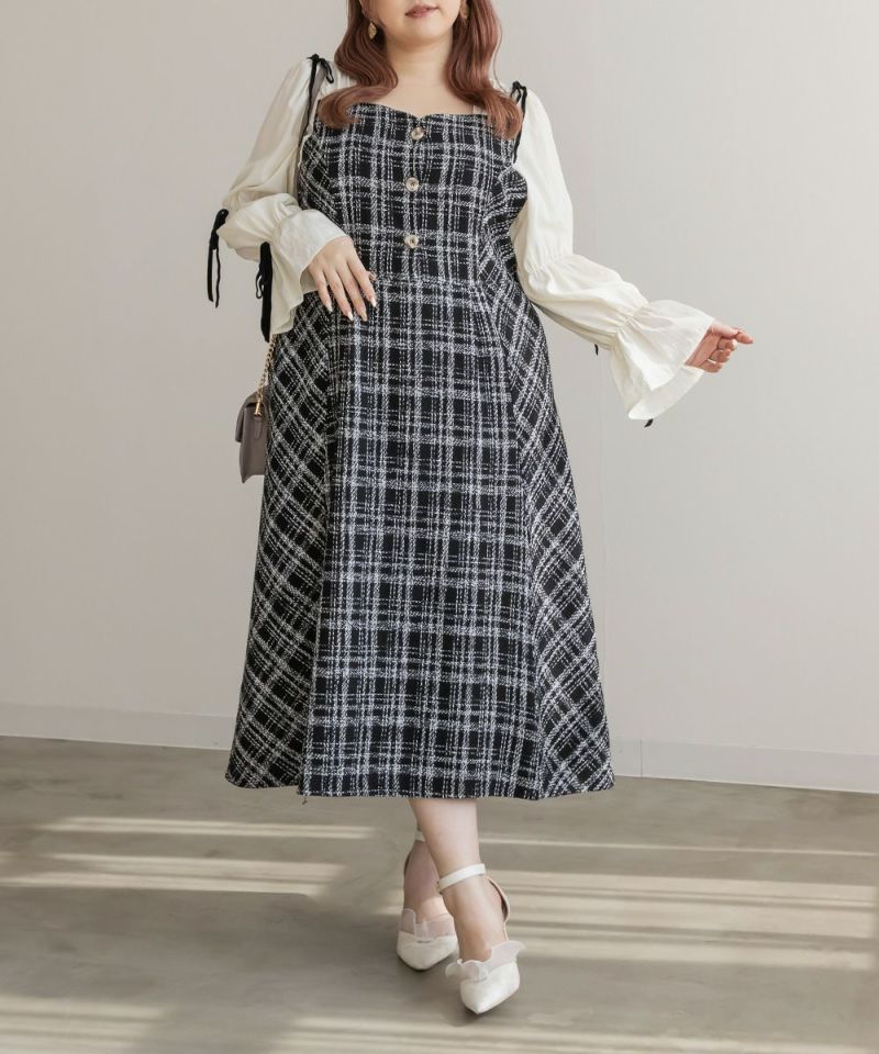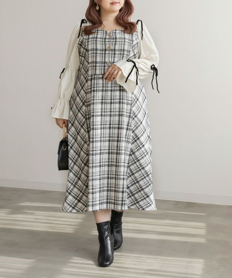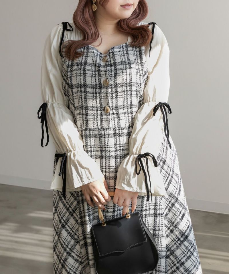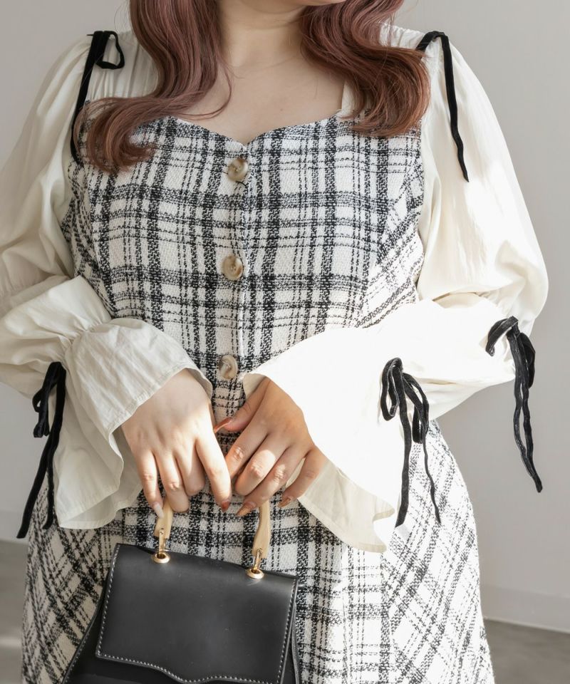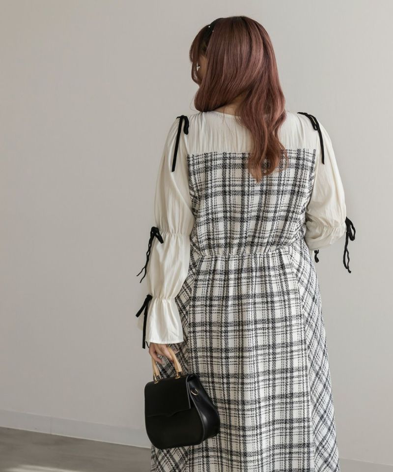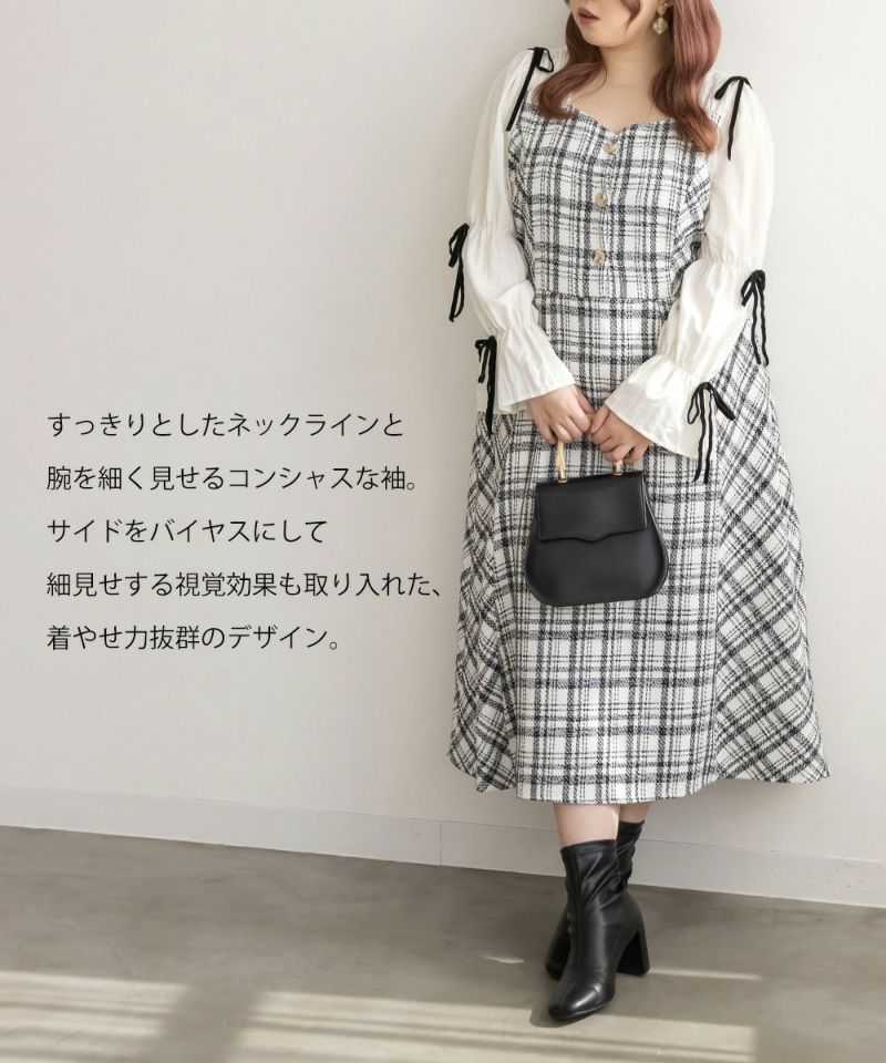 3Lを着てちょうどいいサイズでした。しっかりとした生地だから、ボディランは全く拾いません◎後ろウエストはゴムだから着ている時も窮屈感はありませんでした。袖にはベロアのリボンがついていて細目で上品だから子供っぽくならない印象です。しかも袖がクシュっとしたデザインだから、二の腕がすっきり細く見えます!チェック柄が実はサイドだけ斜めになっていて、身体を細く見せてくれるのも嬉しいポイントです。お出かけやデートにたくさん着ていきたいです♪