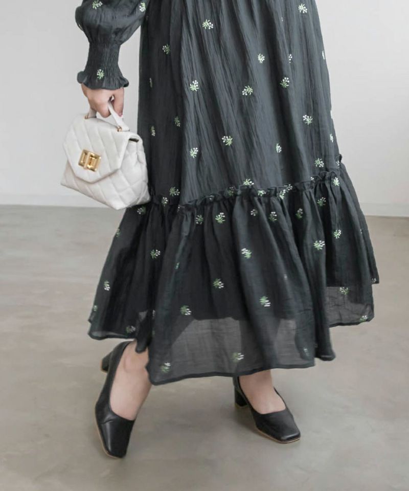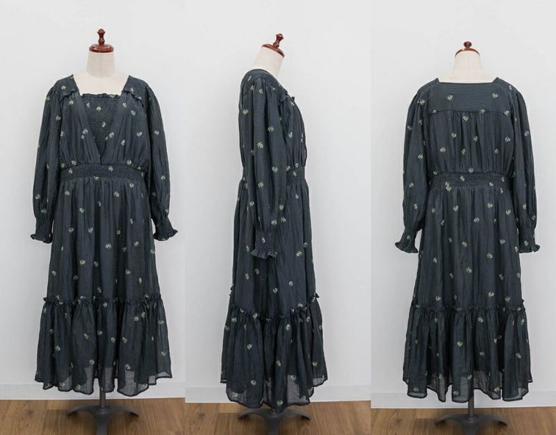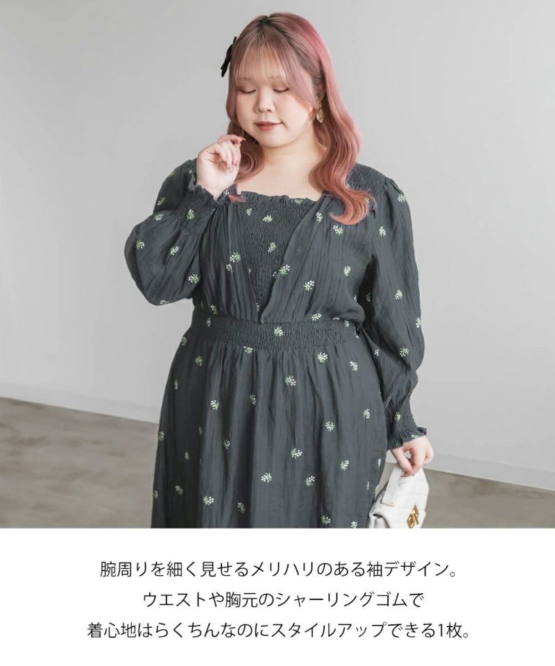 3Lを着てちょうどいいサイズでした。花柄の生地が派手ではないけど洗練されたデザインになっていて、細かいところまで可愛いです!胸元が見えないけれどすっきりとしたネックデザインがポイントでウエストシャーリングで着心地が楽なのも嬉しいです!大人っぽいけどフェミニンになれる、他にはないワンピースです♪