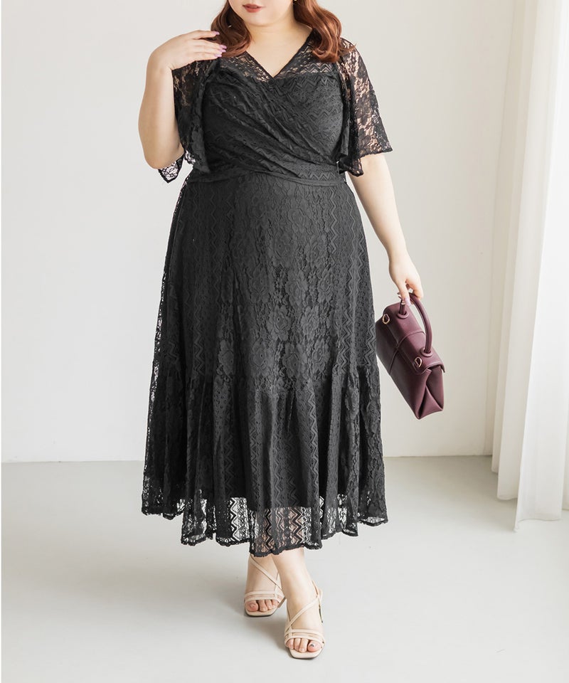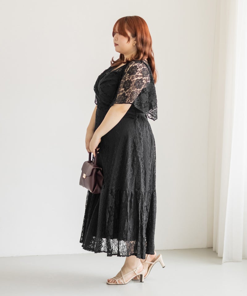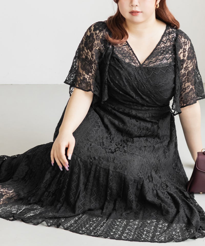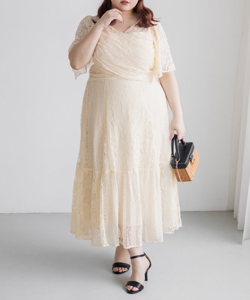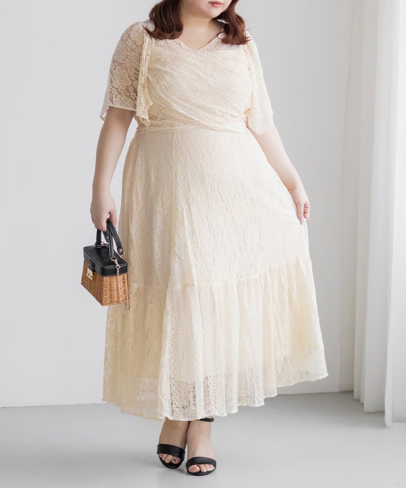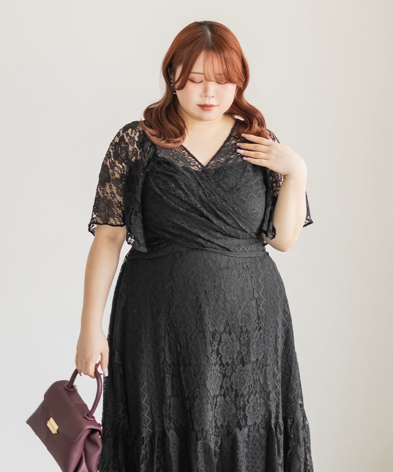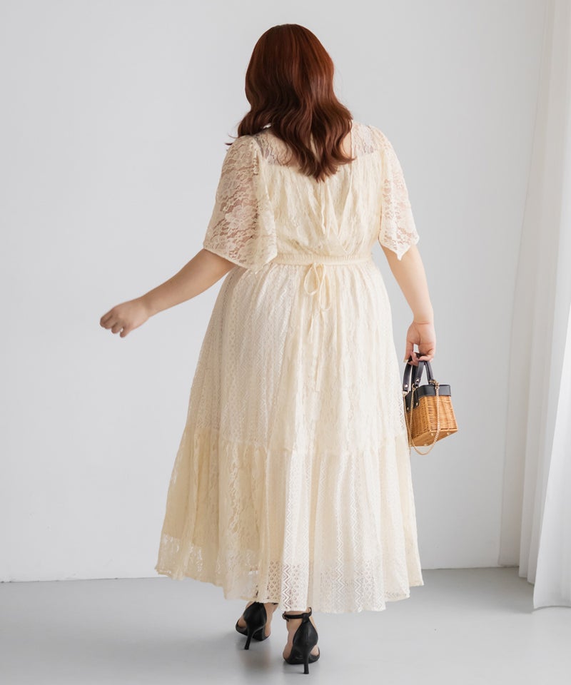 3Lサイズを着用しましたが程よいゆとりがありストレスなく着用できました◎レース生地自体は伸びないですが、後ろゴムで楽ちんながら、前から見たときはすっきり見えてきれいめな印象です。胸元のクロスレースが繊細で、上品なフェミニンムードが漂うデザインです!デコルテは開きすぎず、程よい肌見せで大人っぽく着られます♪軽やかな素材感とシルエットで、デイリーにもお出かけにも着まわせる万能ワンピースです!ちょっと特別なシーンにもぴったりで、色々なシーンで活躍しそう♪