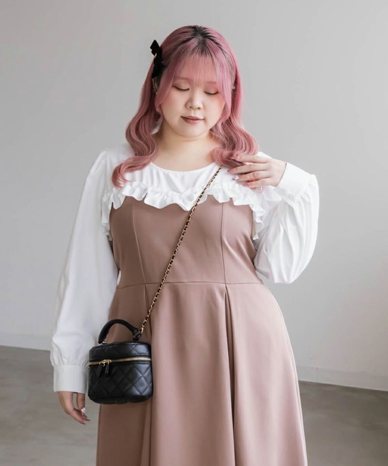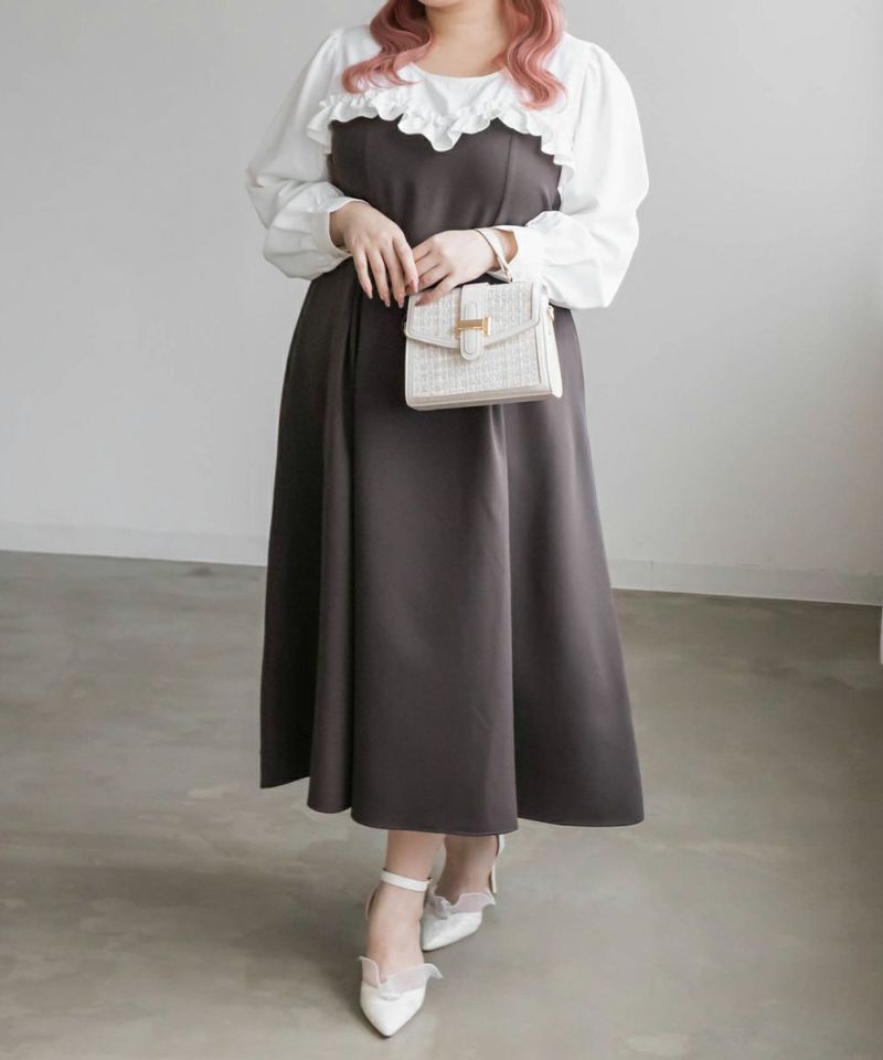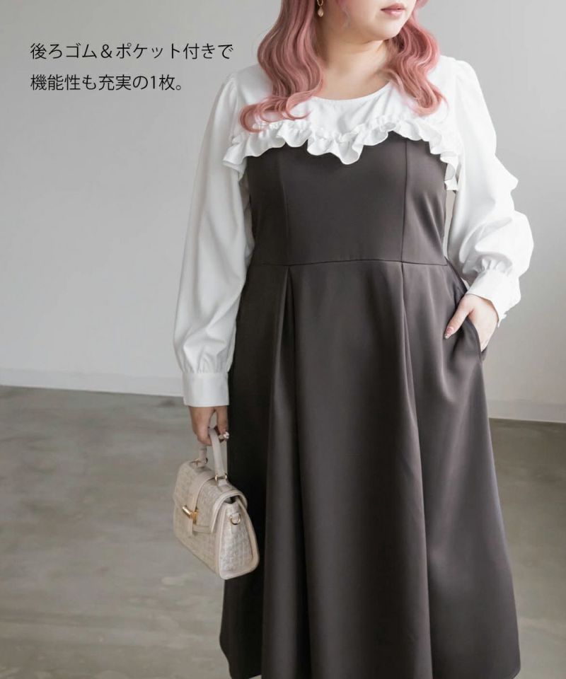 3Lサイズを着用してちょうどいいサイズ感でした。ウエストは後ろゴムなのと首回りも詰まっていないのでとっても楽ちんな着心地です!お腹やヒップはフレアに広がるスカート部分がしっかりカバーしてくれます!1枚でさらっと着られるけど、デザインが可愛いし、こなれた印象になれるワンピースです♪ドッキング切替になっていて、ブラウスを重ね着しているような着こなしになれます◎胸元のフリルが華やかで、女性らしく着こなせます!