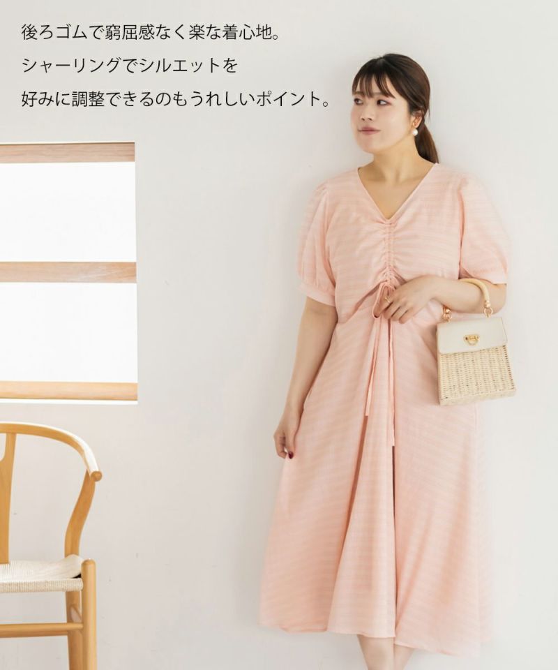 3Lサイズを着用しました!全体的に締め付け感はなく、ウエストは後ろゴムでらくちんなのも嬉しい♪スカート部分はふんわり広がるフレアシルエットで、体型カバーも叶うデザインです!胸元のシャーリングリボンは調整できるので、自分の好みのバランスに合わせられるのも嬉しいポイント。さらっと軽やかな生地感で、暑い日でも快適に着られそう!デートにもお出かけにもぴったりな、ときめきワンピです◎