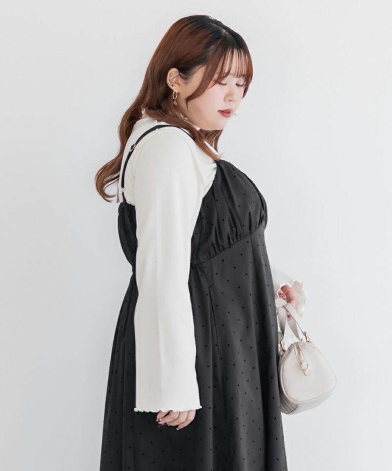 3Lサイズを着用して丁度良い着心地で、いつも通りのサイズで問題なく着用出来ました。後ろはゴム入りなのと、肩紐は調節できる仕様で、ストレスフリーな着心地です。生地もさらっとした感じで重さも少なくオールシーズン着られる1枚。胸元は今っぽいギャザーがあしらわれたデザインで、バストをコンパクトに見せてくれます。胸下に切り替えがあるので足が長くスタイルアップして見えました!トレンドのドット柄のワンピースは今季持っておきたいアイテムの一つです!落ち着いた色味なので、インナー次第で様々な着こなしが楽しめます♪