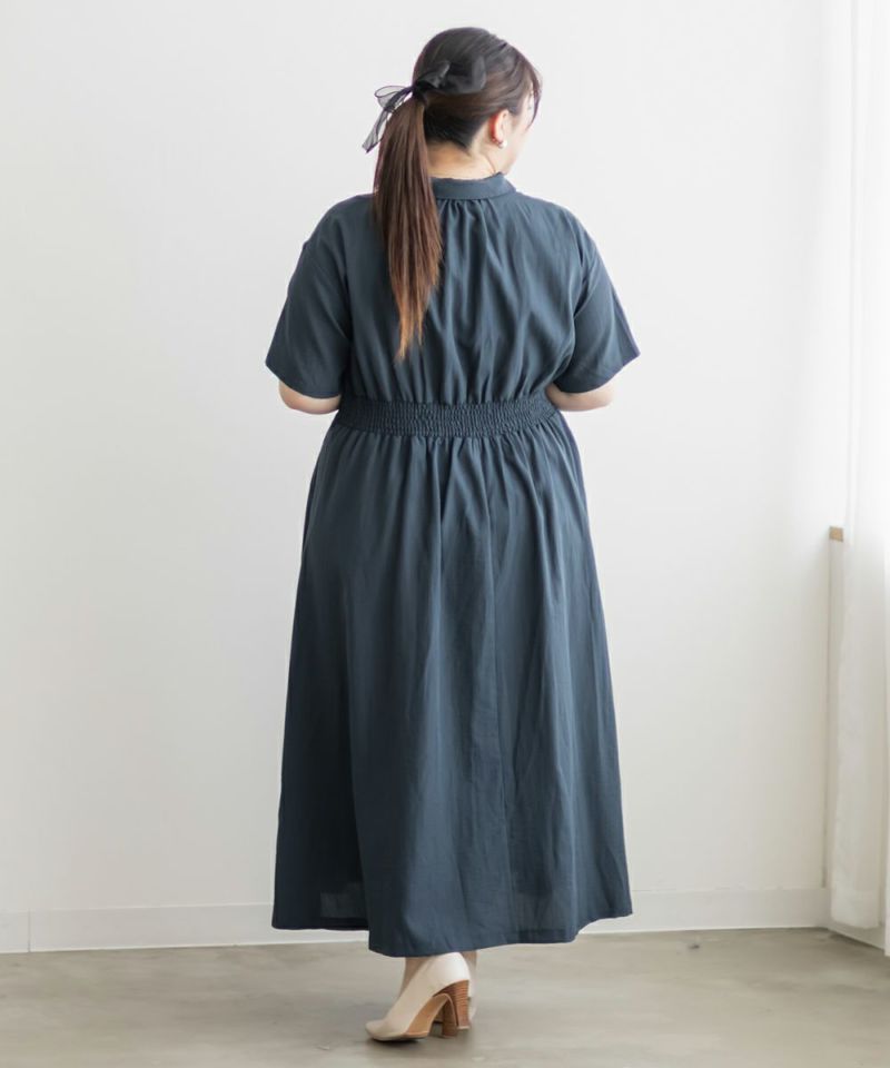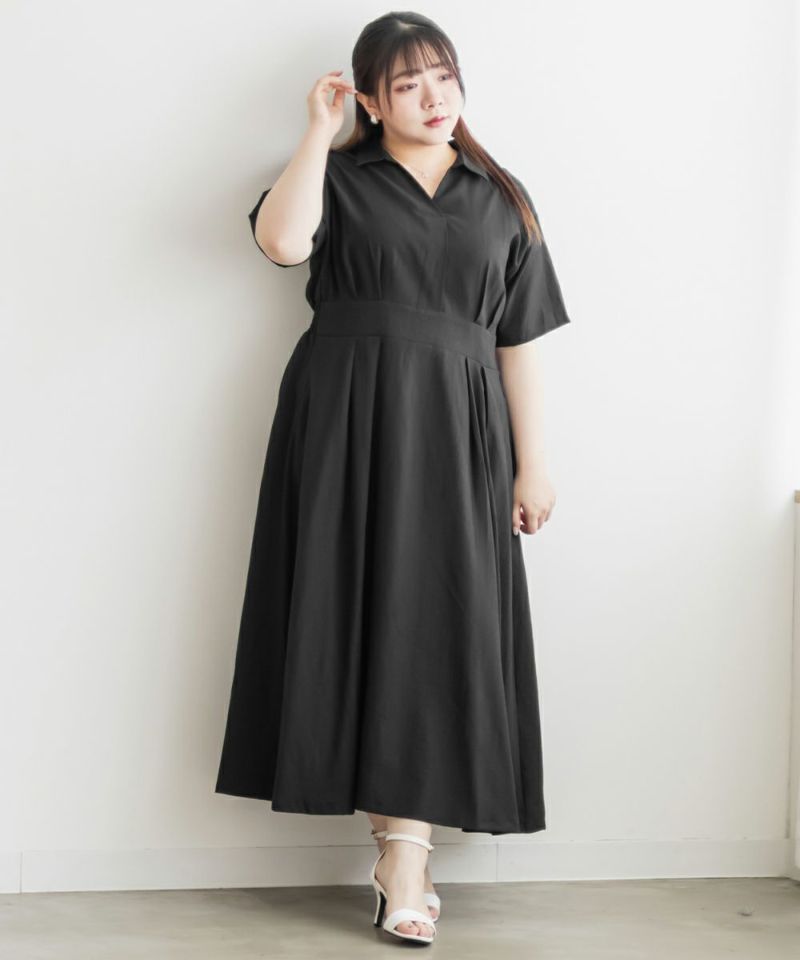 3Lサイズを着て身幅や腕まわりにも余裕があり、窮屈さは感じませんでした。ウエストのタックがしっかり効いていて、着るだけで自然にメリハリのあるシルエットに◎ネックはしっかり開いていて、着脱がしやすいのも嬉しいポイントです♪スキッパー襟は首まわりがすっきり見えて、大人っぽくきちんと感のある印象に。丈感は足首が少し見えるくらいで、フラットシューズとも好相性です。シンプルながらも女性らしさが詰まったデザインで、お仕事やお出かけにも活躍しそうな1枚です!