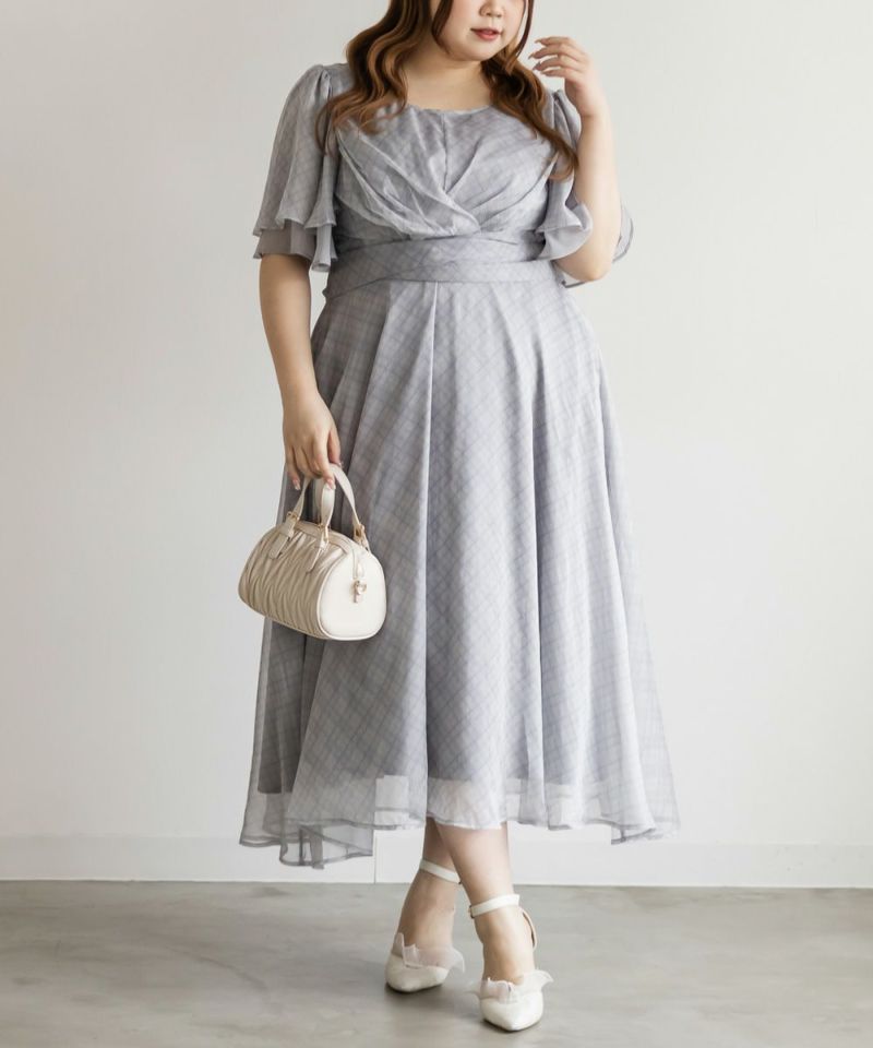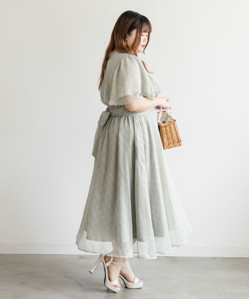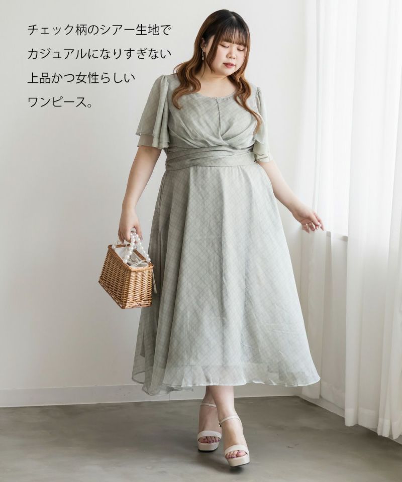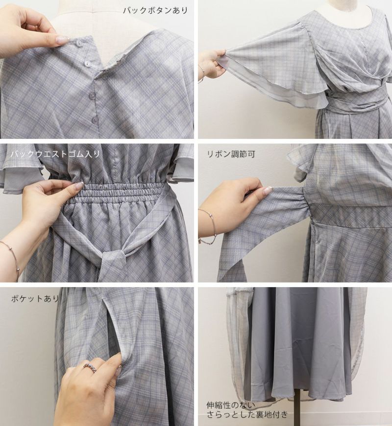 3Lサイズで全体的にちょうどよく、軽い生地感で快適な着心地でした。後ろゴムなので特に窮屈感はなかったです。透け感のあるチェック柄が儚げで、ニュアンス感のある色味が可愛い!共布リボンでウエストマークできるので、メリハリがついてバランス良く見えます。長いリボンを前でクロスして、後ろで結ぶお洒落なデザインになっていて、キュッとくびれを演出してくれるのにさりげなくお腹周りのカバーにもなります。袖とスカートは、気になる部分をふわっと隠してくれるのもうれしいポイント♪裏地付きなので安心して着られ、1枚でさらっと着映えるワンピースです◎