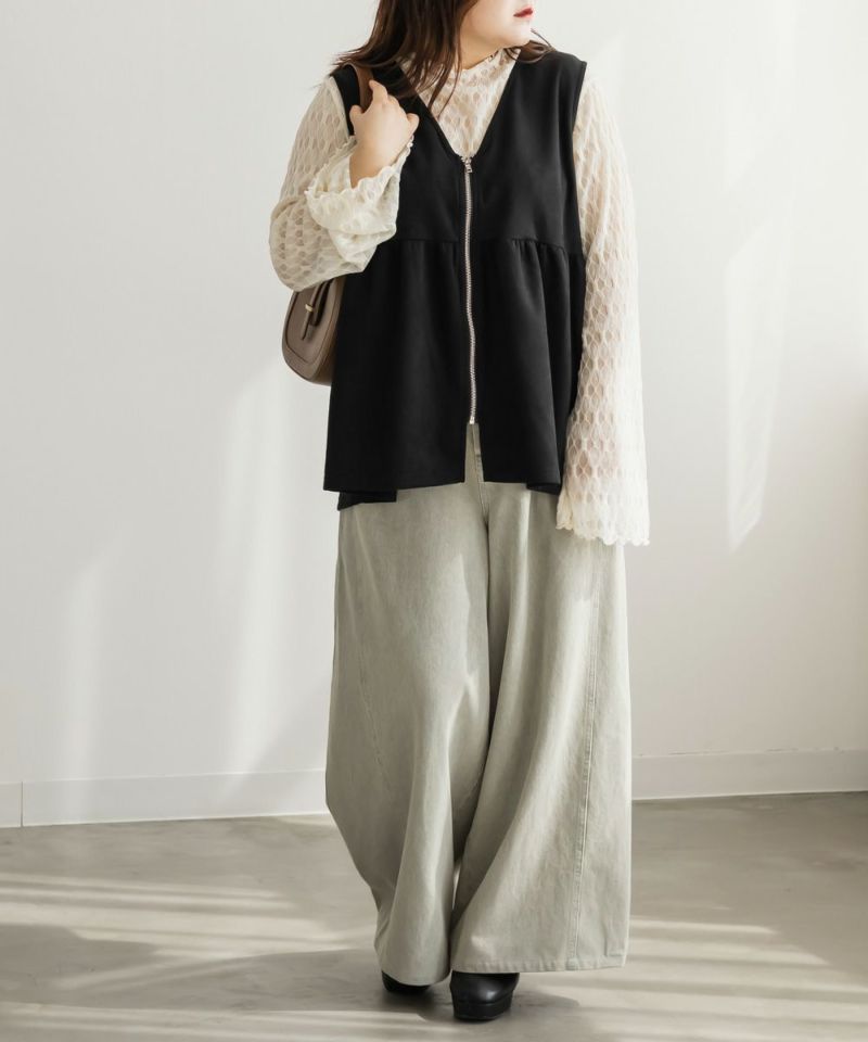 3Lを着てゆとりのあるサイズ感でした。ペプラムデザインでスタイルアップが叶うシルエットなのが嬉しいです♪やわらかいスエード生地が季節感がありコーデに取り入れやすいです!お腹周りをカバーしてくれる丈感なので、Tシャツやニットなどシンプルなトップスと重ねるのがお勧めです!ベストなのでコートなどを羽織ることも出来ると思うのでスタイリング次第でたくさん着回しできそうです◎同じ生地のスカートと合わせて着たら大人ぽく着こなせて可愛かったです!