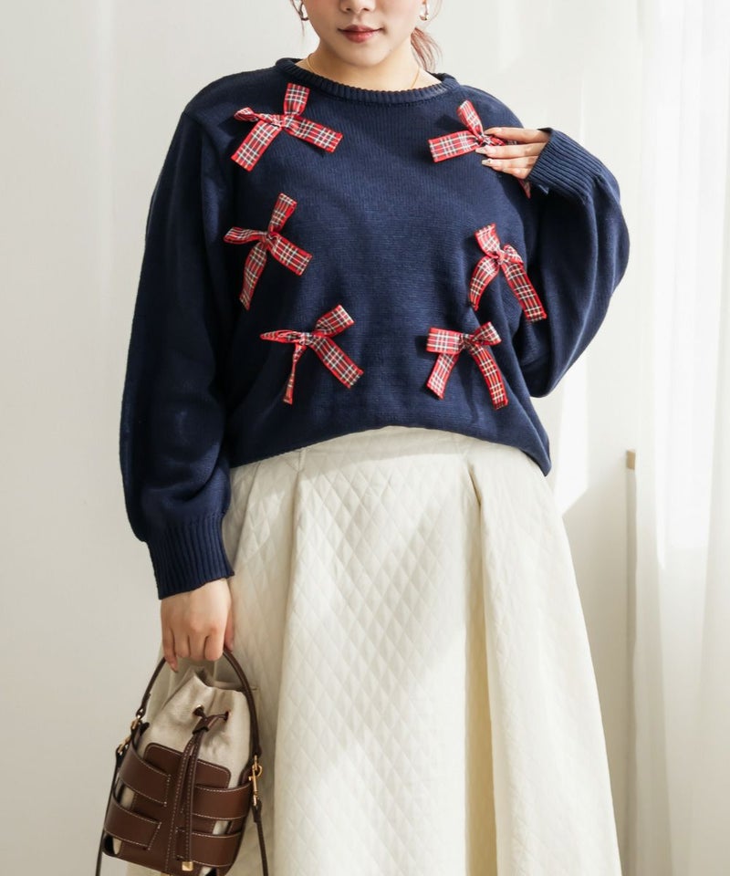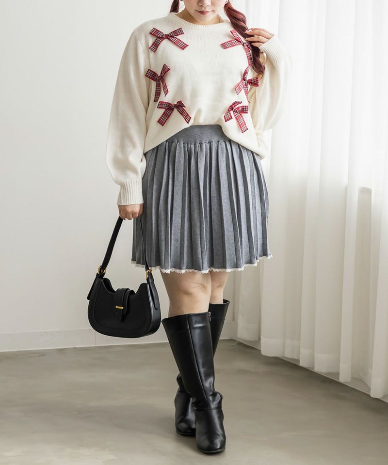 3Lサイズを着用してちょうどいいサイズ感でした。程よい丈感でトップスインしなくても着られるのが魅力です◎チェック柄のリボンが今っぽく、ガーリーコーデにぴったりです♪1枚でかわいくなれるので、シンプルなボトムと相性抜群でおすすめです!コートなどのアウターとも重ねやすいです!