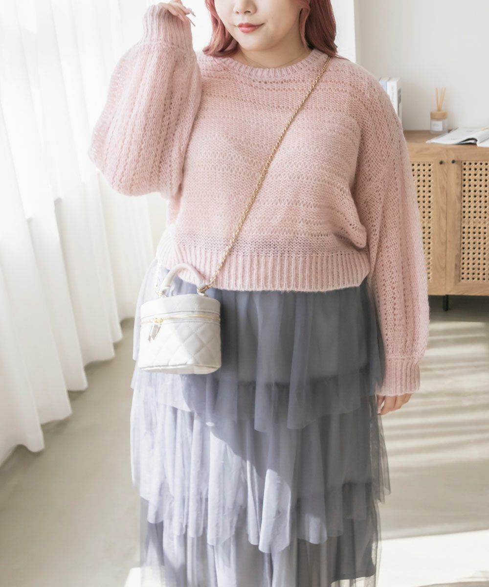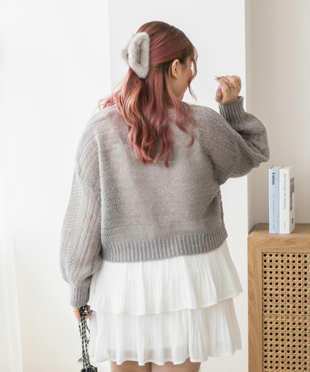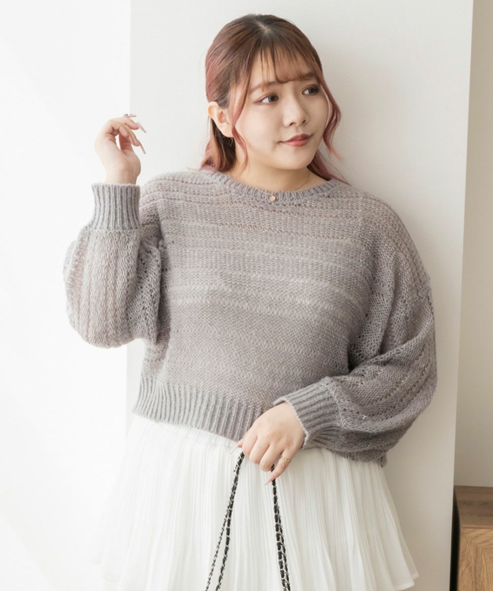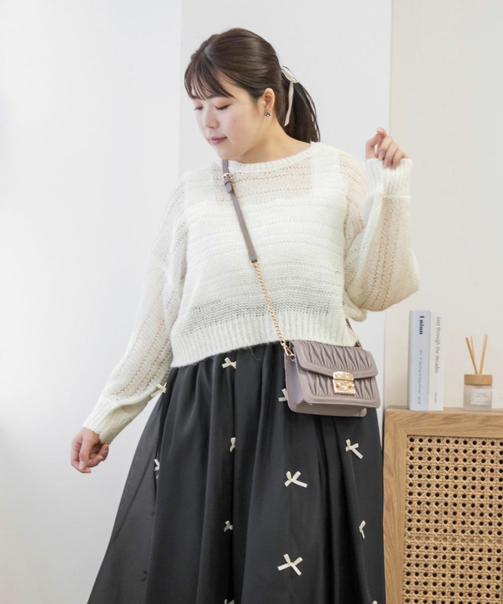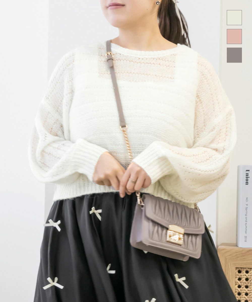 3Lを着て程よいサイズでした。少しゆとりのあるシルエットだから、ボディラインをふんわりカバーしてくれます。短丈だからウエスト位置高めのボトムや、ワンピースと重ねれば着るだけでスタイルアップできるのも嬉しいです!透かし編みになっていて、ほんのり透けるのが女性らしい印象です◎見た目も軽やかで、冬は勿論、春や秋の季節の変わり目にもたくさん着たくなるニットです!