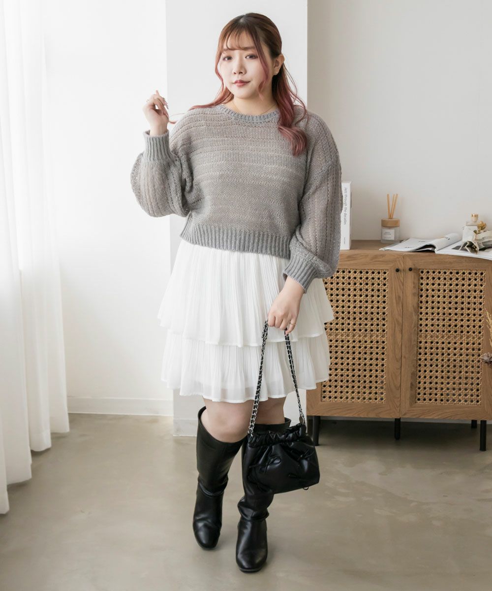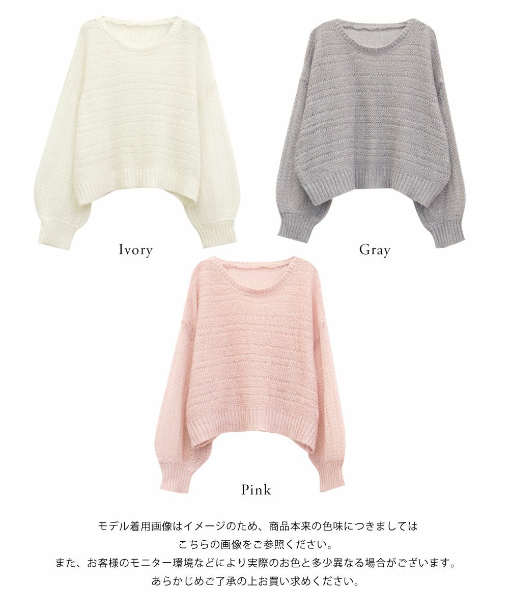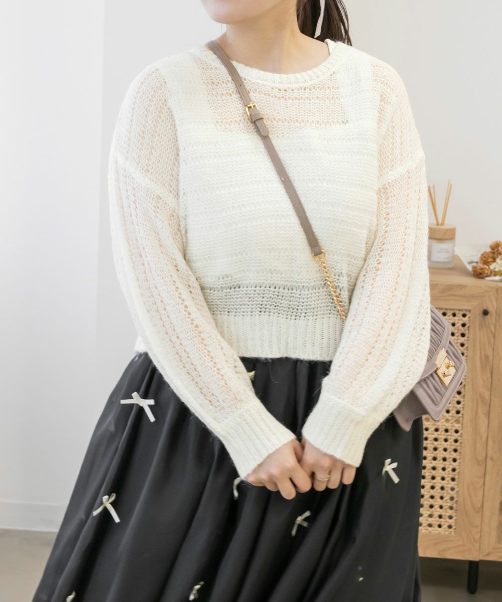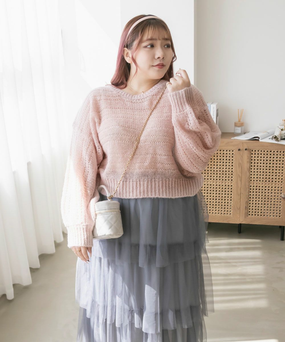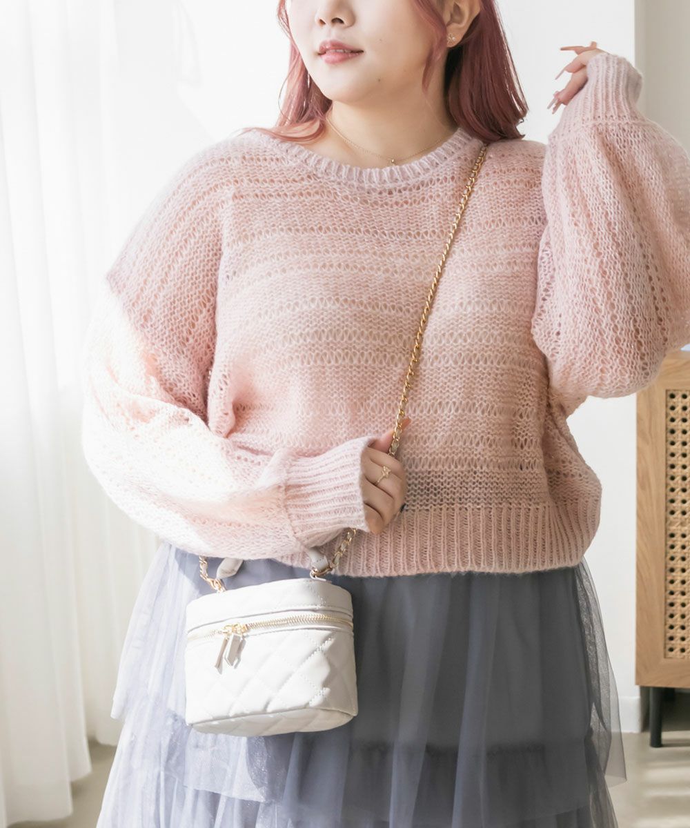 3Lを着て程よいサイズでした。少しゆとりのあるシルエットだから、ボディラインをふんわりカバーしてくれます。短丈だからウエスト位置高めのボトムや、ワンピースと重ねれば着るだけでスタイルアップできるのも嬉しいです!透かし編みになっていて、ほんのり透けるのが女性らしい印象です◎見た目も軽やかで、冬は勿論、春や秋の季節の変わり目にもたくさん着たくなるニットです!