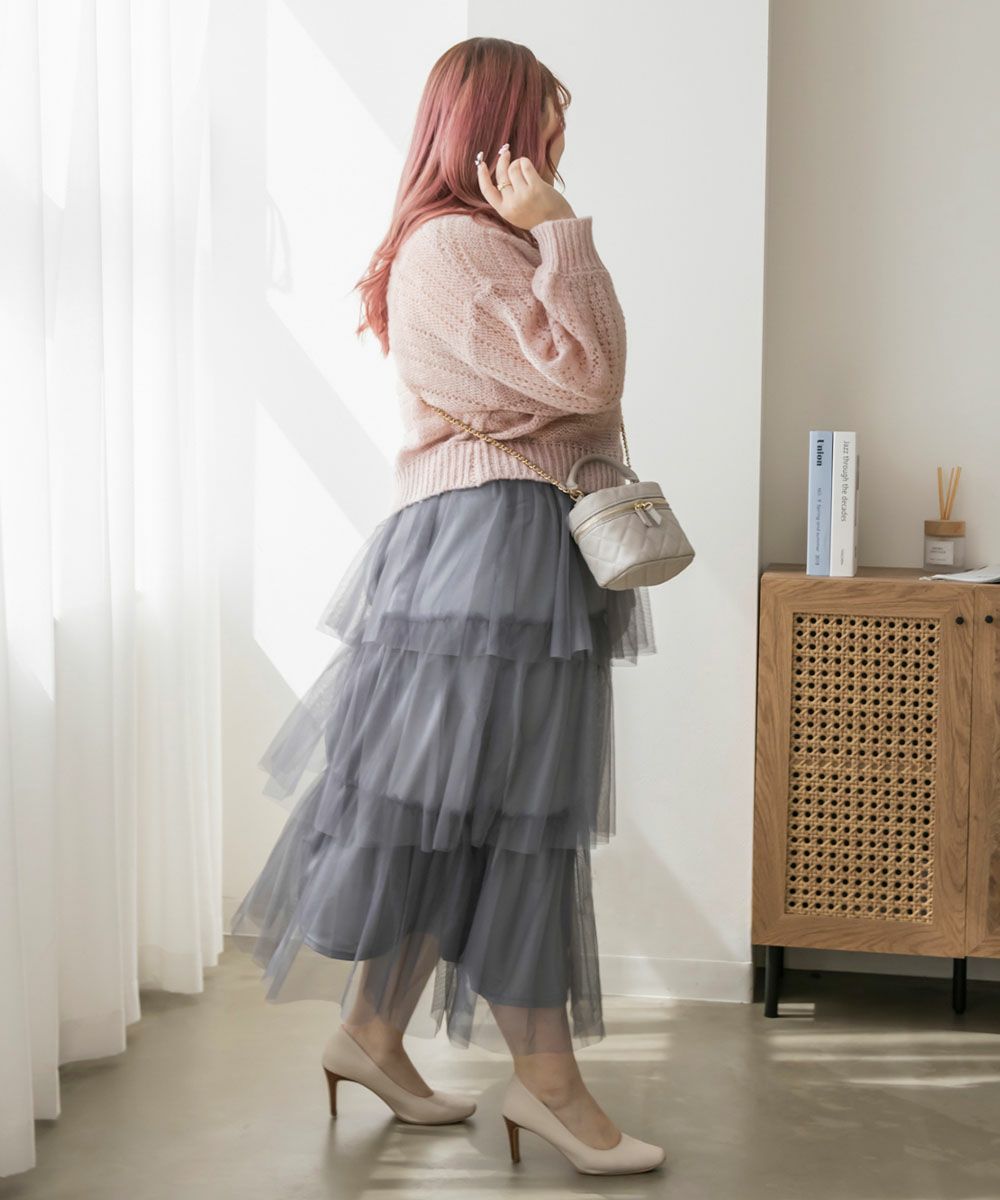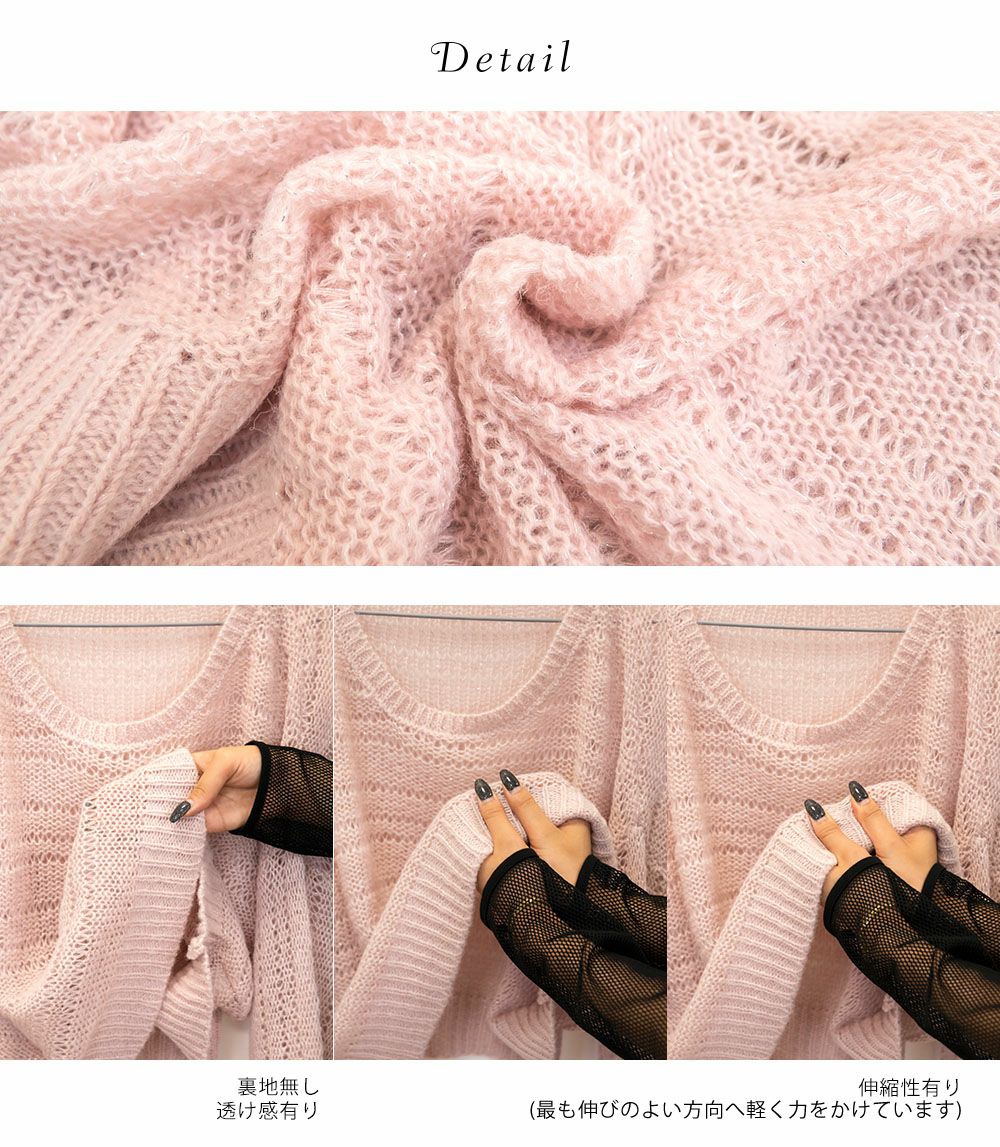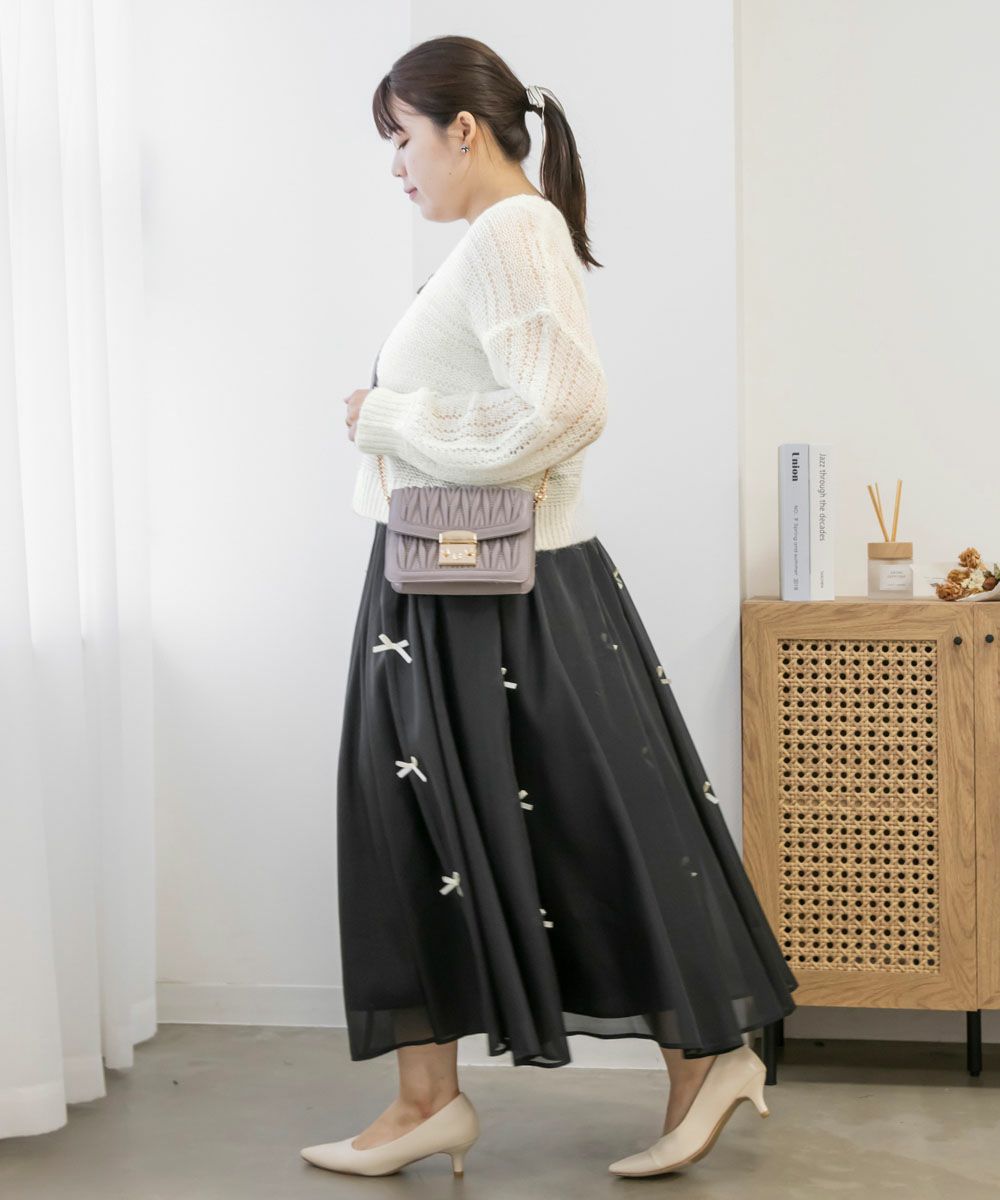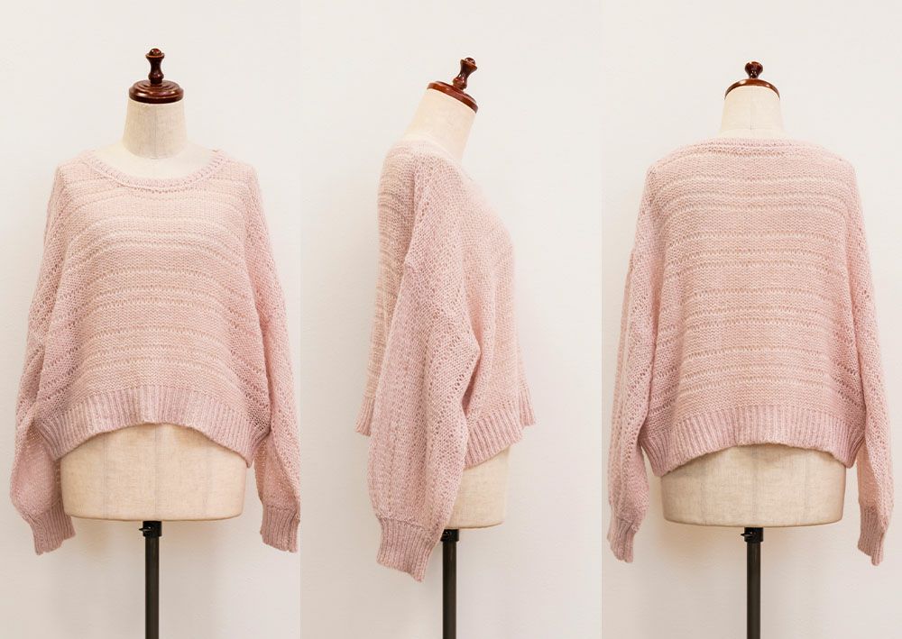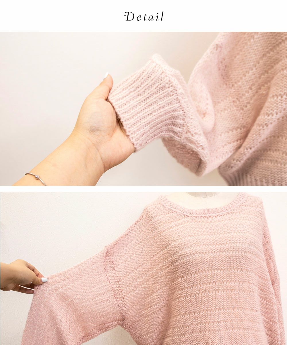3Lを着て程よいサイズでした。少しゆとりのあるシルエットだから、ボディラインをふんわりカバーしてくれます。短丈だからウエスト位置高めのボトムや、ワンピースと重ねれば着るだけでスタイルアップできるのも嬉しいです!透かし編みになっていて、ほんのり透けるのが女性らしい印象です◎見た目も軽やかで、冬は勿論、春や秋の季節の変わり目にもたくさん着たくなるニットです!