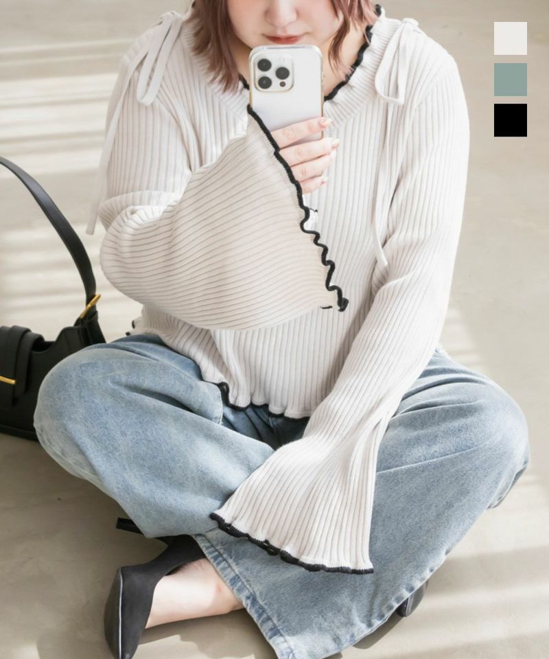 LLを着てちょうどいいサイズでした。柔らかくて着心地の良いリブニットで、身体にピタッとフィットしないくらうのゆとりがあります。襟はゆったりとあいていて、肩には細目のリボンが大人っぽくついています。袖は、正直なところお鍋を食べたりは難しいデザインですが、腕が長く、手元が女性らしさたっぷりな印象になれるおしゃれ可愛いデザインです◎手元に向かって広がるから二の腕を強調しないのも嬉しいです♪少し短めの着丈だから、裾を出した状態でバランスよく、着られて、スタイルが良く見える1枚です!