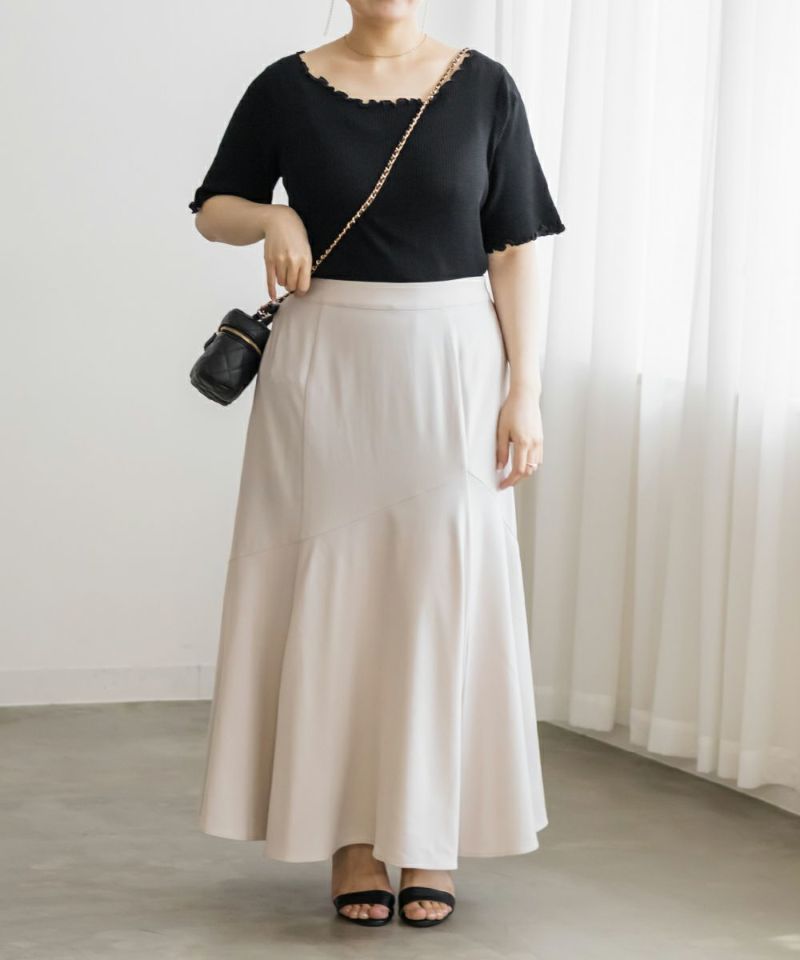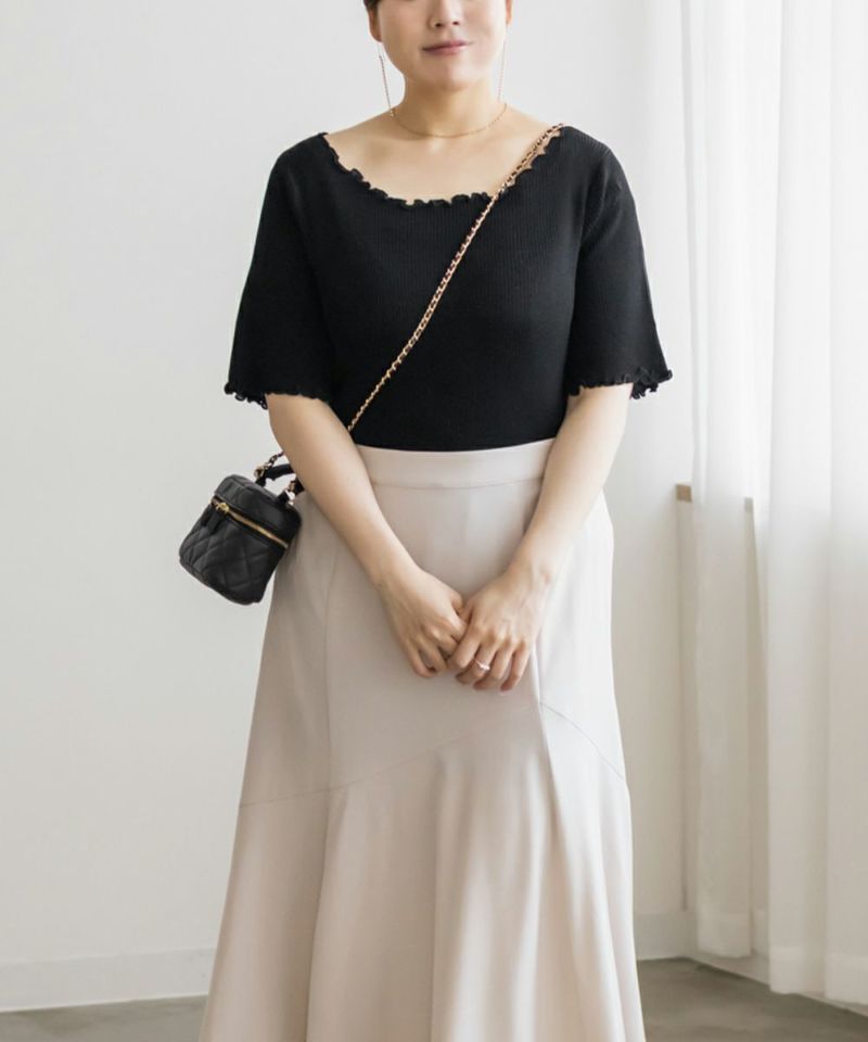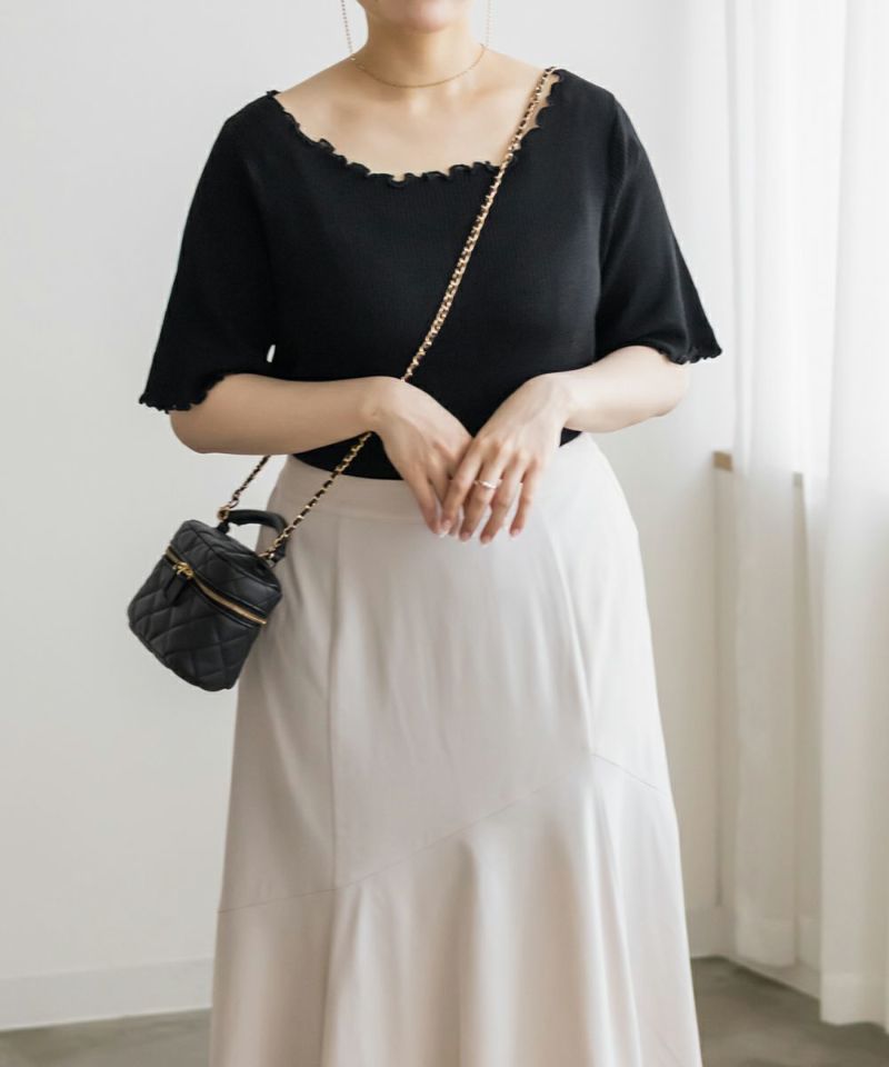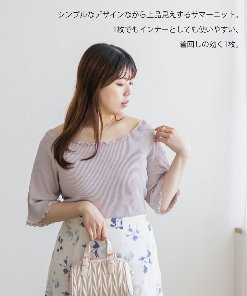 3Lを着て程よいサイズでした!薄手のさらっとしたシャリ感のあるサマーニットで着心地も抜群◎ニット素材なのでとても上品に着られます!ネックラインと袖・裾がメロウになっていて、シンプルだけどおしゃれなデザイン!ベーシックにトップス使いはもちろん、キャミワンピなどのインナーとしても使いやすいです◎1枚持っておけば色々なスタイリングに使える便利なトップスです!