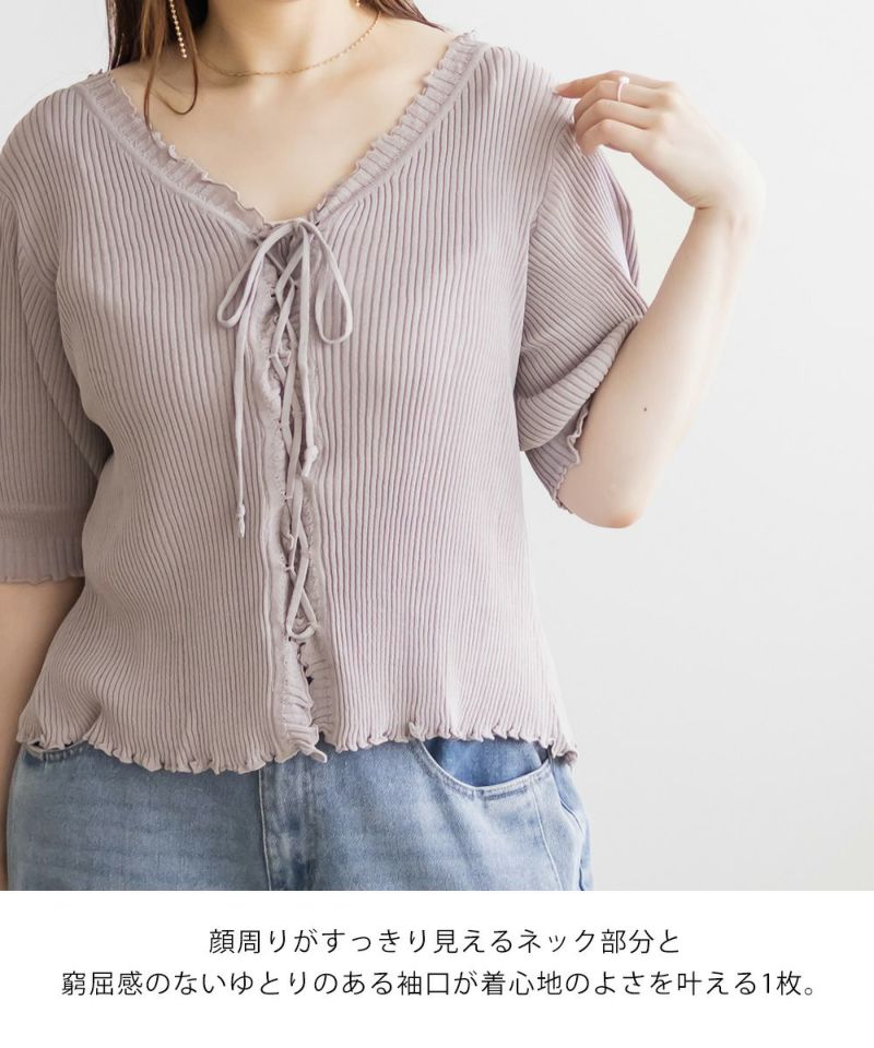 3Lサイズを着用して、ちょうどいいサイズ感でしたゆとりを持たせたサイズ感で、リブの伸縮性があるのでストレスフリーな着心地◎シャリ感のある薄手のサマーニットなので真夏でも着ていただけます!フロントのレースアップデザインがアクセントになって、シンプルすぎない華やかさがある1枚です。袖の長さも肘にかかるくらいで、二の腕も自然にカバーしてくれるのが嬉しいポイント!デニムやスカートにも合わせやすく、デイリー使いにぴったりです!