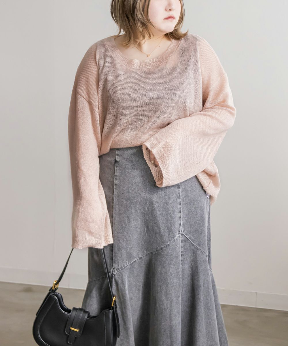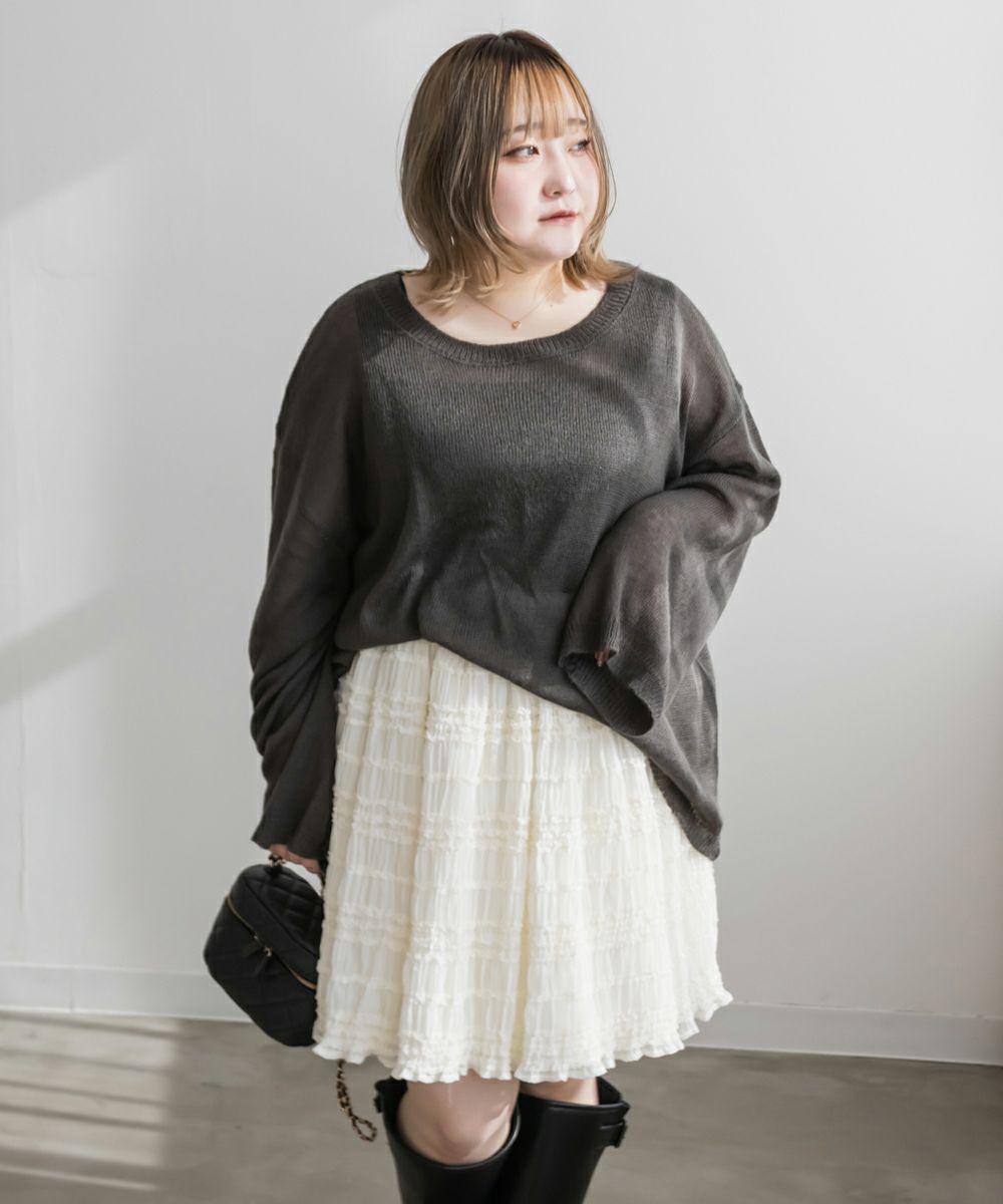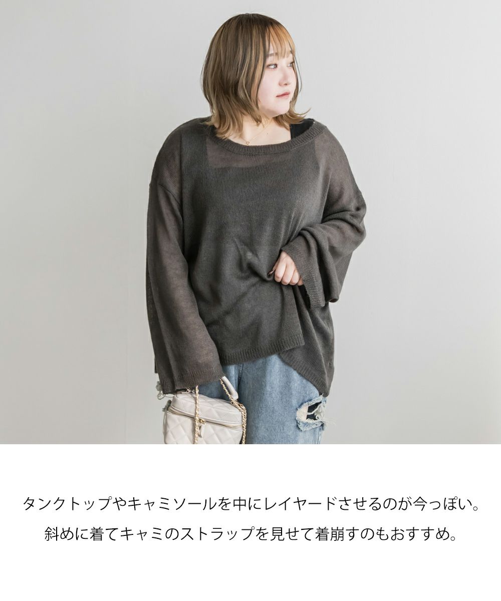 LLサイズを着用して丁度いいサイズでした。ゆるっと着られるサイズ感で楽だしとってもかわいいです♪シアー感が今っぽくて絶妙な抜け感が大人っぽい1枚です。ネックラインはすっきり開いていて、詰まった感じが無く綺麗なデコルテにしてくれます。洗練されたスタイルにぴったりなオトナっぽニットで、1枚でももちろん重ね着したりして秋~春と長く使えるのもポイントです。薄手のシアーニットなので、ごわつかず、タックインしても着やすい印象です!