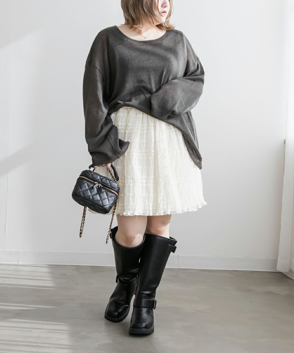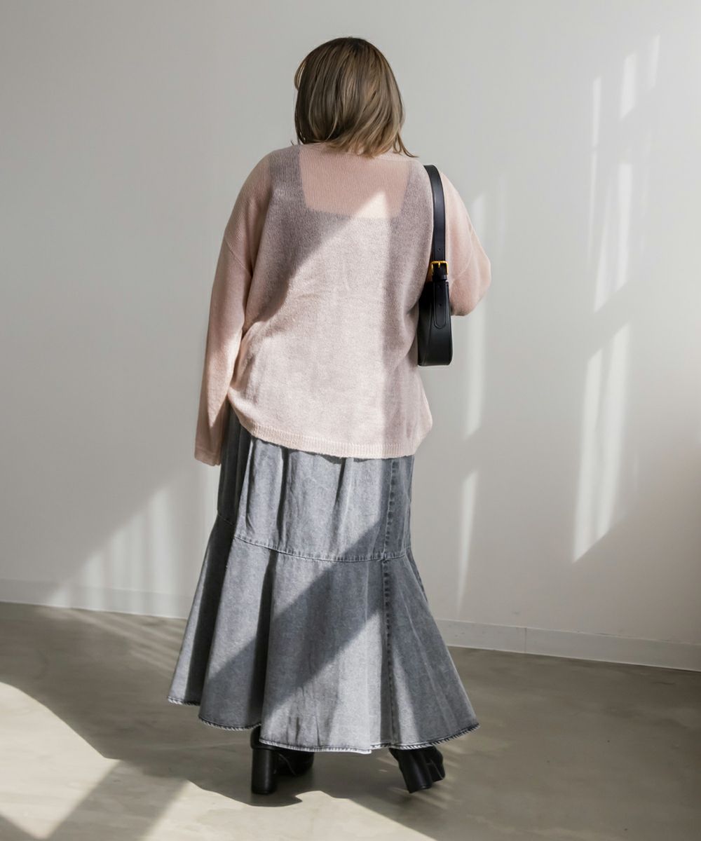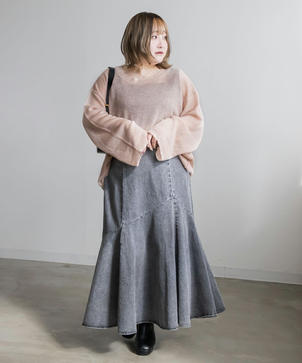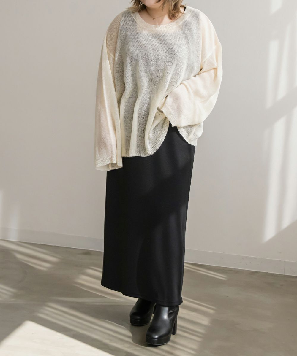 LLサイズを着用して丁度いいサイズでした。ゆるっと着られるサイズ感で楽だしとってもかわいいです♪シアー感が今っぽくて絶妙な抜け感が大人っぽい1枚です。ネックラインはすっきり開いていて、詰まった感じが無く綺麗なデコルテにしてくれます。洗練されたスタイルにぴったりなオトナっぽニットで、1枚でももちろん重ね着したりして秋~春と長く使えるのもポイントです。薄手のシアーニットなので、ごわつかず、タックインしても着やすい印象です!