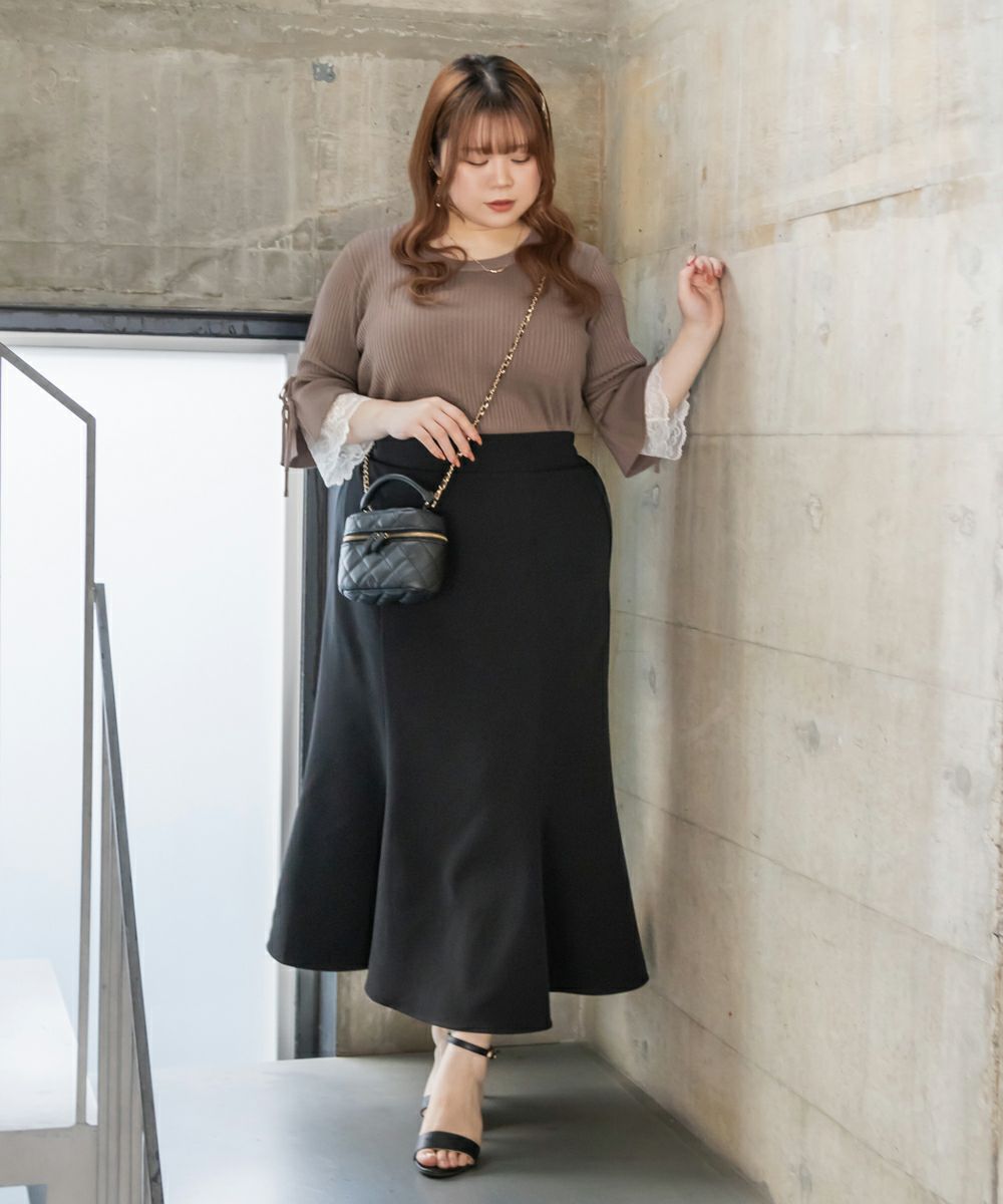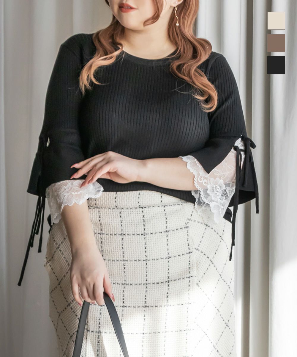 3Lサイズを着用してちょうどいいサイズ感でした。伸縮性の良いニットで着心地ラクチンでした◎リブニットなのですっきりとした印象だし、少し凹凸感もあるのでボディラインを拾いにくいのもポイントです。袖にレースとリボンがついていてとっても可愛いです♪トップスとして1枚で着てもいいし、首元などはシンプルなのでキャミワンピなどど重ねてもいいと思います!7分袖くらいなので手首に抜け感があって野暮ったくならずに着用出来ました!春にピッタリのフェミニンなニットプルオーバーです。