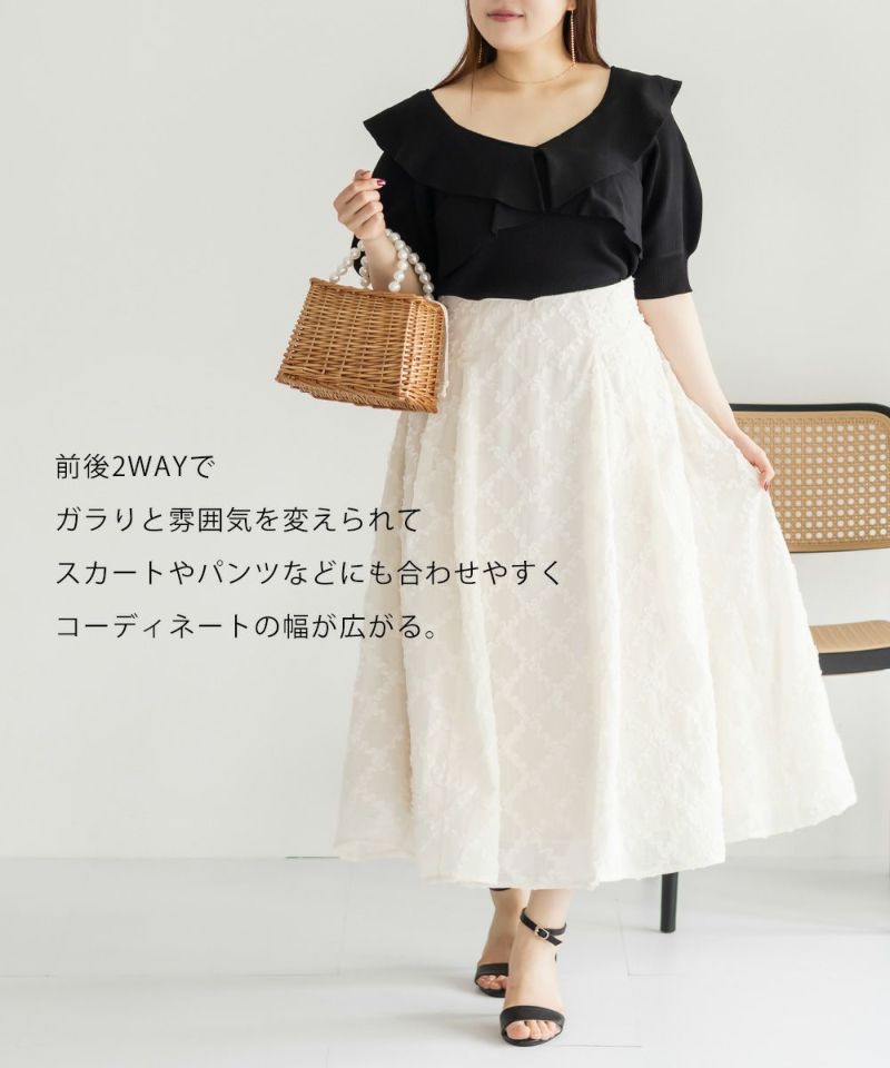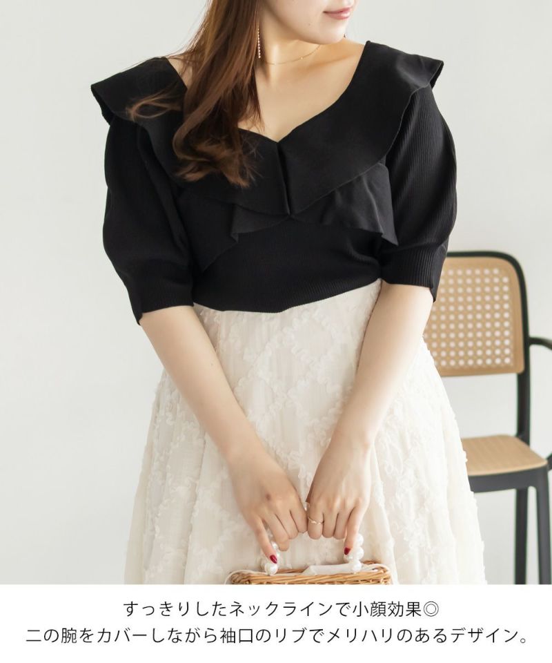 クレット プラスサイズ 大きいサイズ LL 3L 4L プルオーバー トップス Vネック スクエアネック CLETTEオリジナル★前後2WAYフリルニット