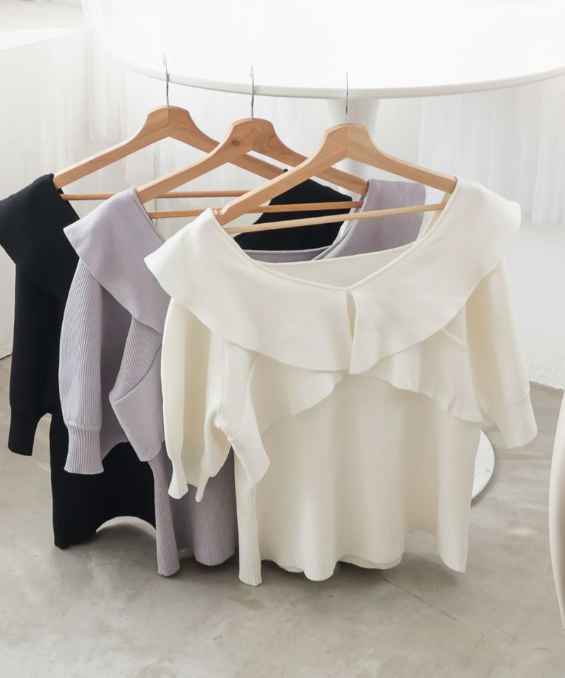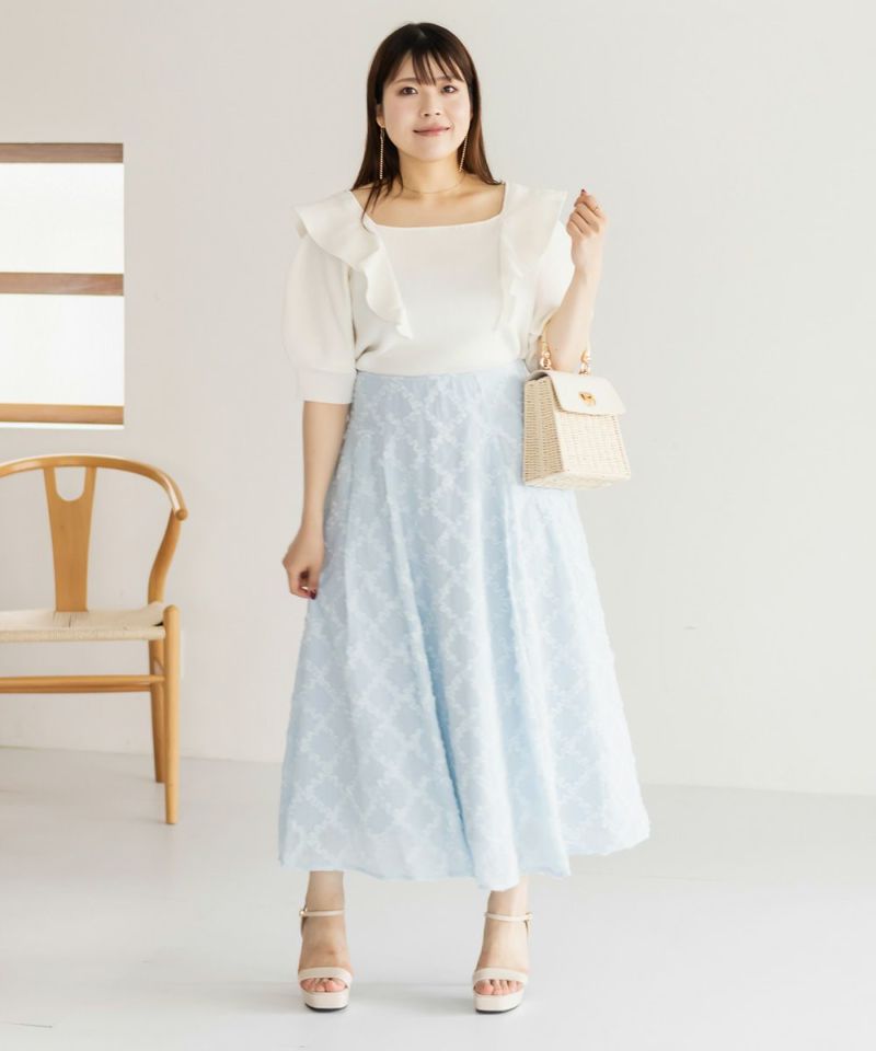 3Lを着てちょうどいいサイズ感でした。身幅にも袖まわりにもゆとりがあり体のラインを拾いすぎず、柔らかくフィットしてくれるリブ素材で、着ていてとても楽でした♪ フリルデザインが目を引く可愛さで、前後2WAY仕様だから気分に合わせて着まわせるのも嬉しいポイント!真夏でも着られるサマーニットなので、これからの季節に大活躍しそうです♪