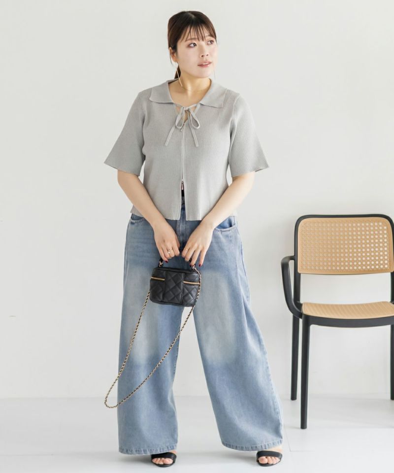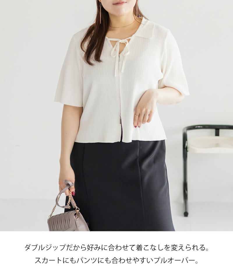 クレット 大きいサイズ プラスサイズ ポロ リボン サマーニット 半袖 プルオーバー トップス CLETTEオリジナル★襟付きダブルジップリブニット