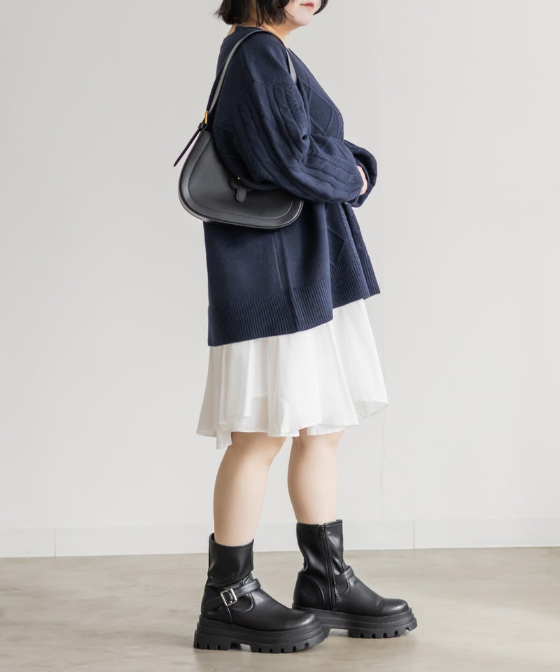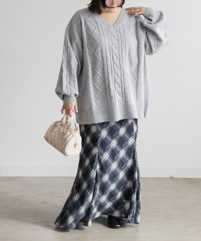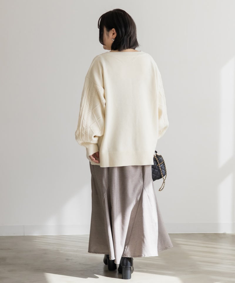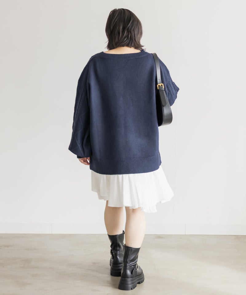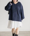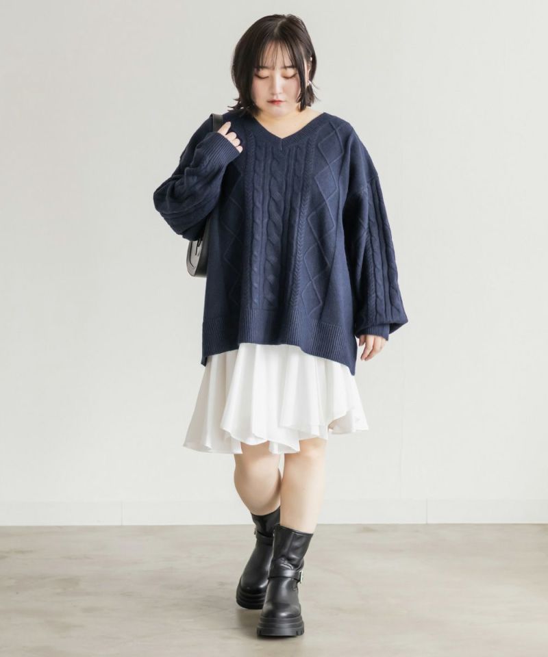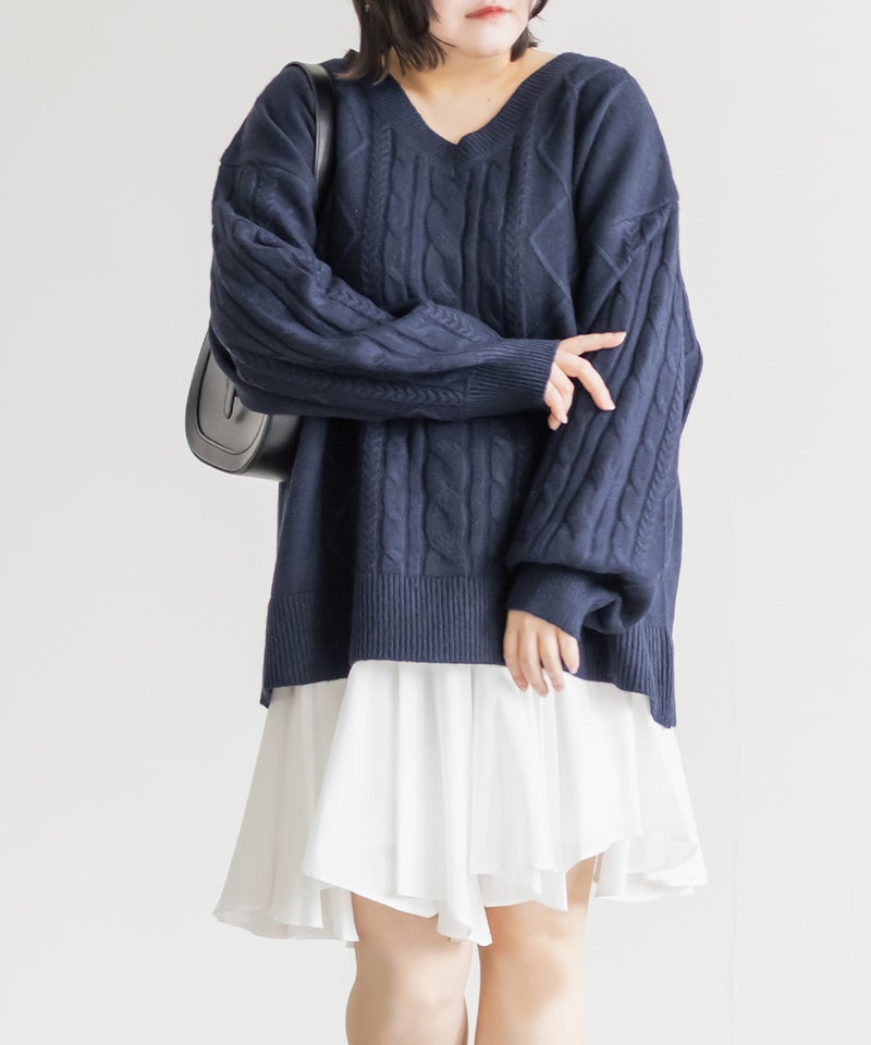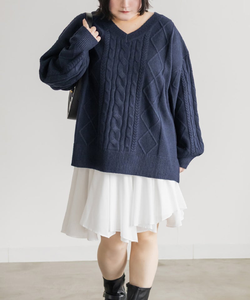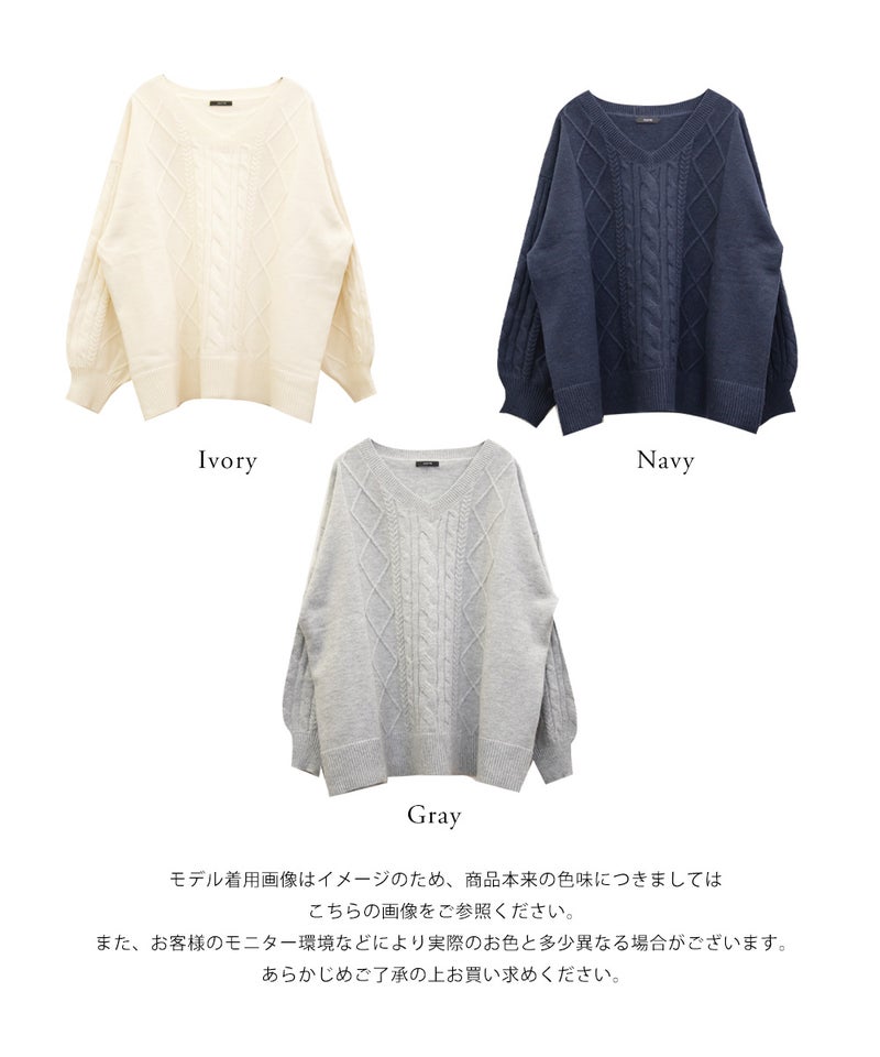 【design】ゆったりとしたサイズ感が可愛いニットプルオーバー。オーバーサイズでボディラインを隠すだけではなく、大き目のケーブル編みで視覚的に身体を小さく見せて、Vネックは小顔効果をプラス、余裕のある袖デザインは二の腕を細く見せてくれます。ヒップラインまで隠れる安心感のある着丈です。【material】柔らかな手触りのニット素材。コートやジャケットを着られるように、分厚すぎないようボリュームを抑えた実用性のある厚み感もポイント。(アウターのデザインによりますのでご注意ください)【styling】ゆったりとしたシルエットだからすっきりとしたシルエットのボトムを合わせると綺麗にまとまります。プリーツスカートやマーメイドスカートと合わせれば女性らしく、すっきりとしたデニムと合わせれば爽やかな印象に。カジュアルなイメージのあるケーブル編みニットにはアクセサリーや小物に女性らしいアイテムを合わせると上級者感が出せるのでおすすめです。