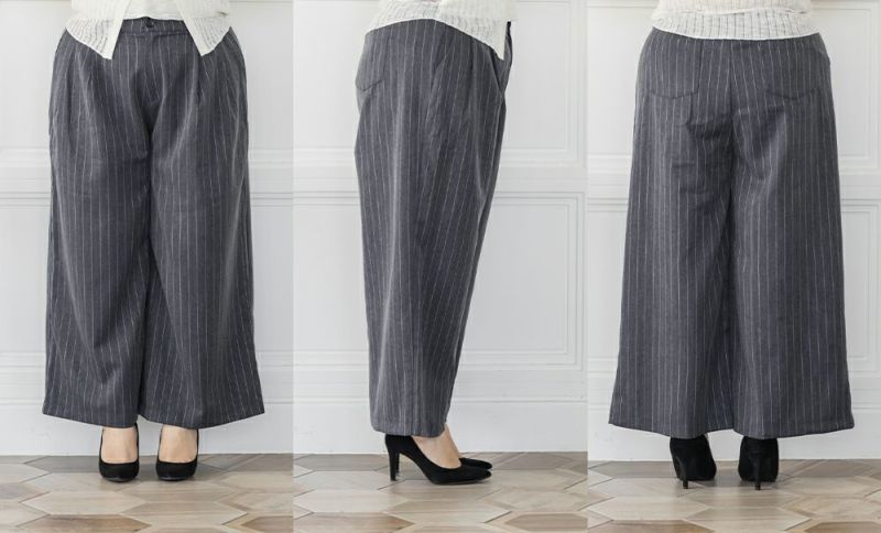 3Lを着用してちょうどいいサイズでした。程よくゆとりがありつつすっきり見えるシルエットで、楽ちんな着心地です!今っぽいストライプ柄がポイントで、トレンドっぽい可愛い系のトップスとも、シンプルなトップスとも相性がいいのでおすすめです。オールシーズン使える便利なワイドパンツです!さらっとした落ち感素材にストライプ柄をのせたワイドパンツは、脚のラインを拾わずリラックスして着られるのに、きちんと見えするのも嬉しい!後ろウエストゴムでストレスフリーに穿けて、長時間のお出かけにも快適です◎