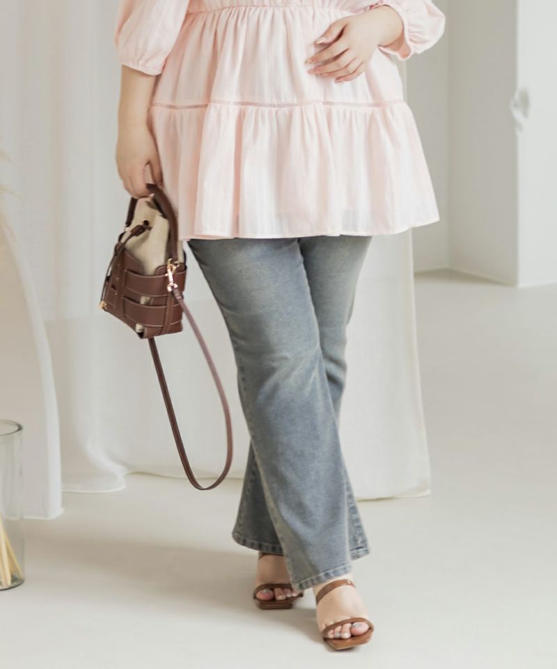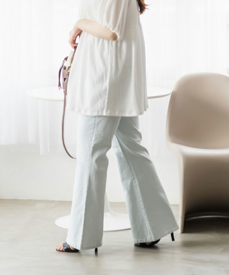 3Lサイズを着用してぴったりのサイズ感でした。ストレッチが効いていて窮屈感のない着心地です!デニムでもカジュアルになりすぎずに女性らしい印象になれるフレアシルエットで、美脚に見えるのでどんなトップスでも合わせやすい形なのが嬉しいです♪定番のデニムカラーでオールシーズン使えて1本あると便利なデニムパンツです。