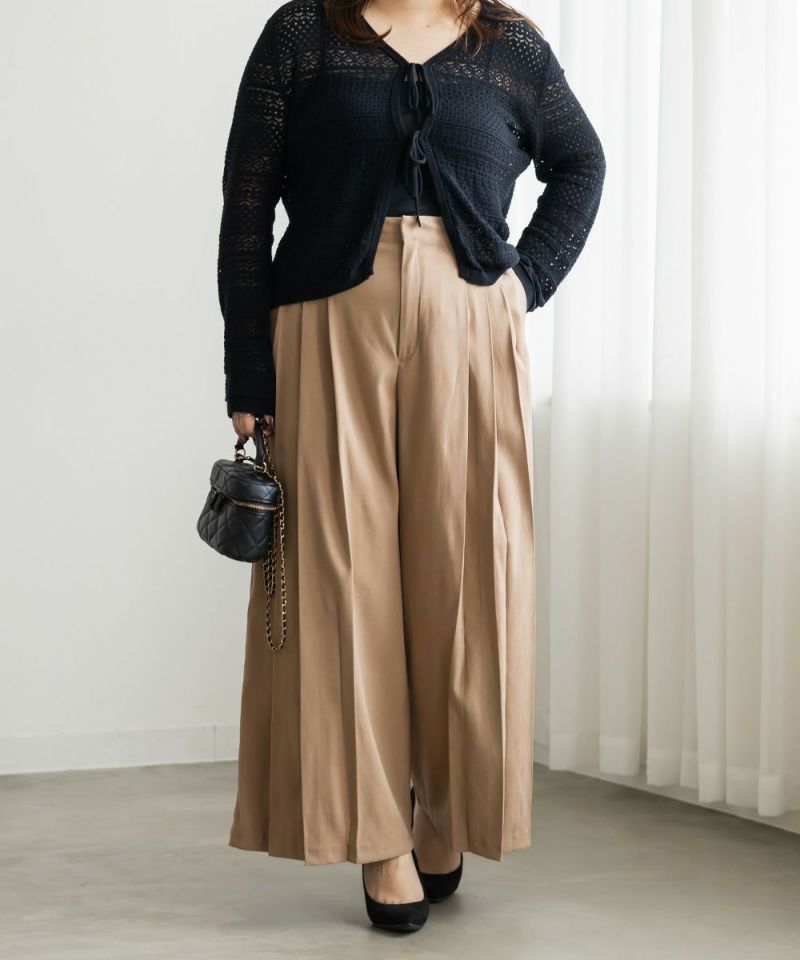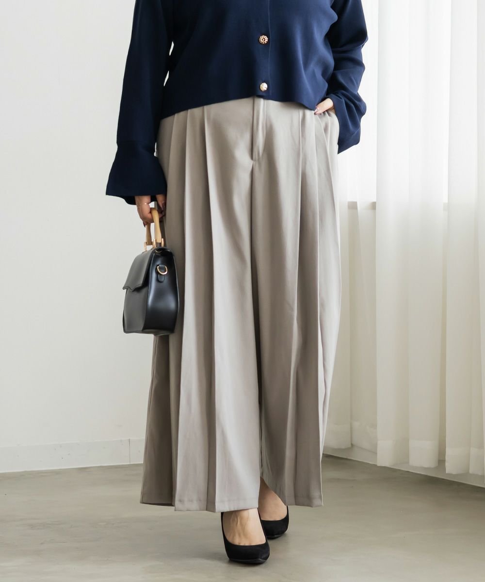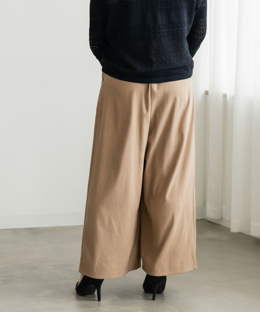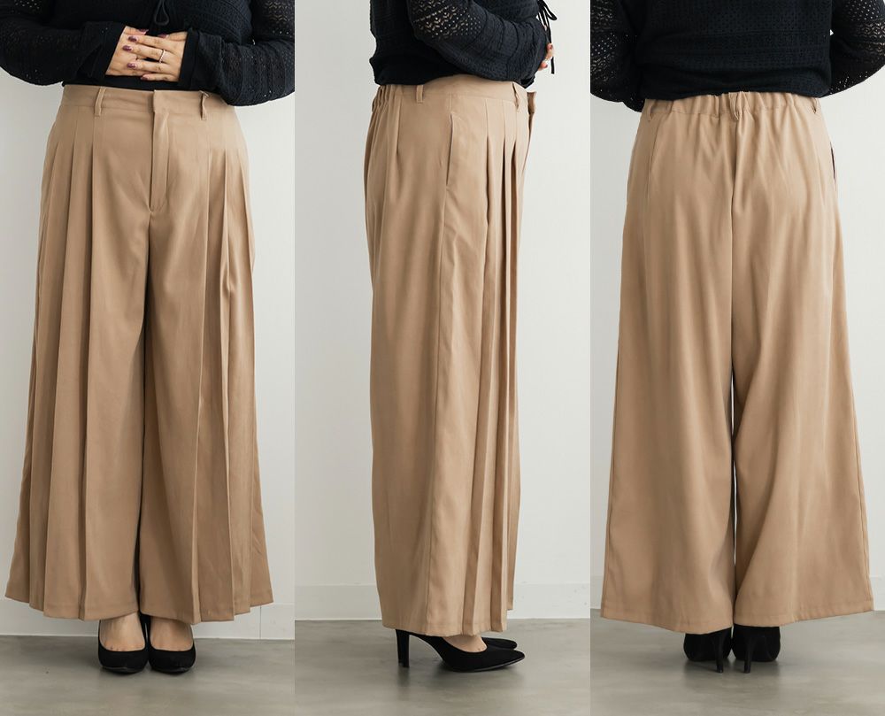 3Lを着用してちょうどいいサイズでした。程よくゆとりがありつつすっきり見えるシルエットで、楽ちんな着心地です!後ろウエストゴムでストレスフリーに穿けて、長時間のお出かけにも快適です◎季節感のあるスエードっぽい生地ですが、薄手で軽いので、動きやすさもありました。プリーツデザインがお洒落でシンプルなトップスとも相性がいいのでスタイリングに悩まず着回しが出来ます。オールシーズン使える便利なワイドパンツは脚のラインを拾いずらくリラックスして着られるのに、きちんと見えするのも嬉しいです。デイリーからお仕事までつかえる万能な1本です。