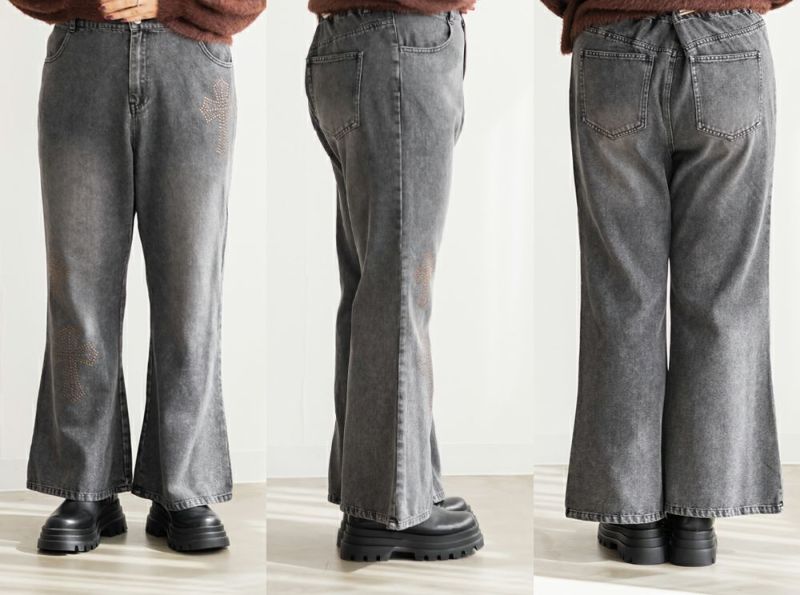 3Lサイズを着用して、ちょうどいいサイズ感でした! フレアシルエットが脚のラインをきれいに見せてくれて、スタイルアップ効果も抜群です!今っぽいスタッズのデザインがアクセントになっていて、シンプルトップス合わせでもおしゃれ見えが叶います◎ 生地は軽めのデニムで、動きやすさもあります。デニムの色味・加工感が可愛くて、スタイリングを格上げしてくれる1本です!