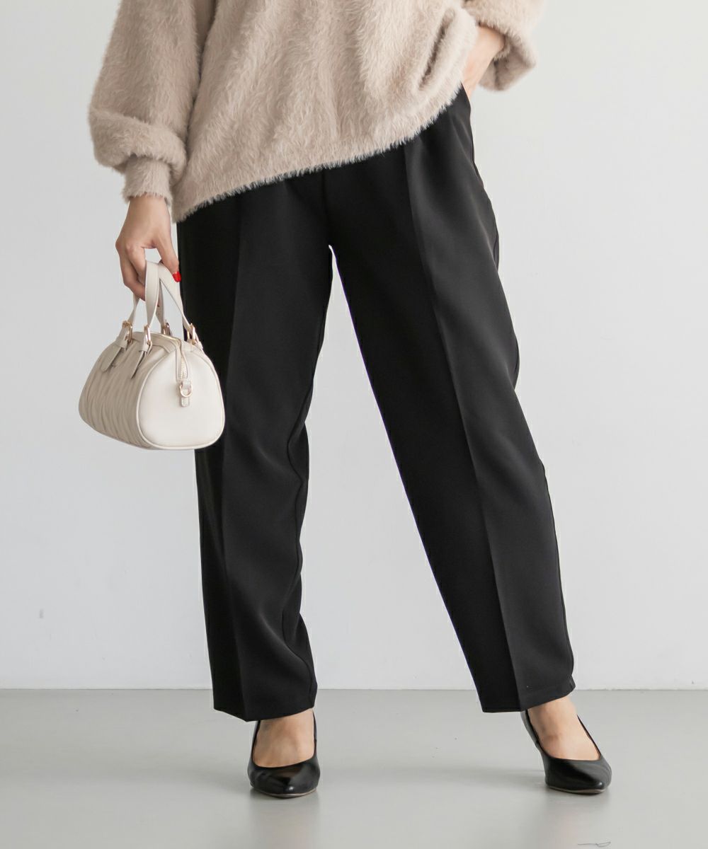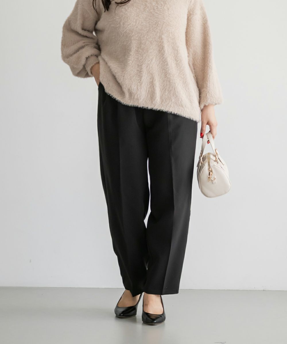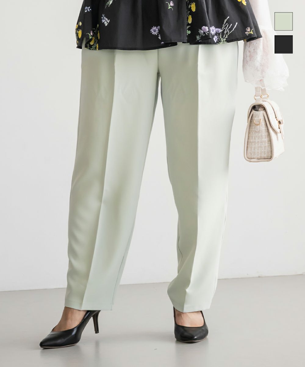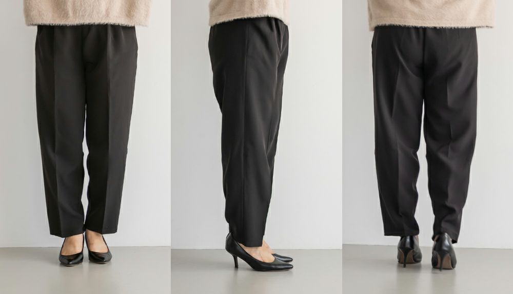 3Lサイズを着用してちょうどいい着心地でした!足元に向かってすっきり細くなるテーパードシルエットで美脚効果のある1枚です◎後ろウエストゴム仕様で窮屈感のない着心地で、さらりとした程よくしっかりとした生地なのでオールシーズン着まわせます!普段使いはもちろん、お仕事や綺麗目な服装が必要なシーンでも活躍しそうです♪