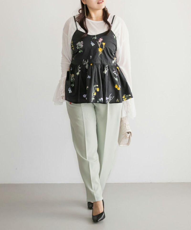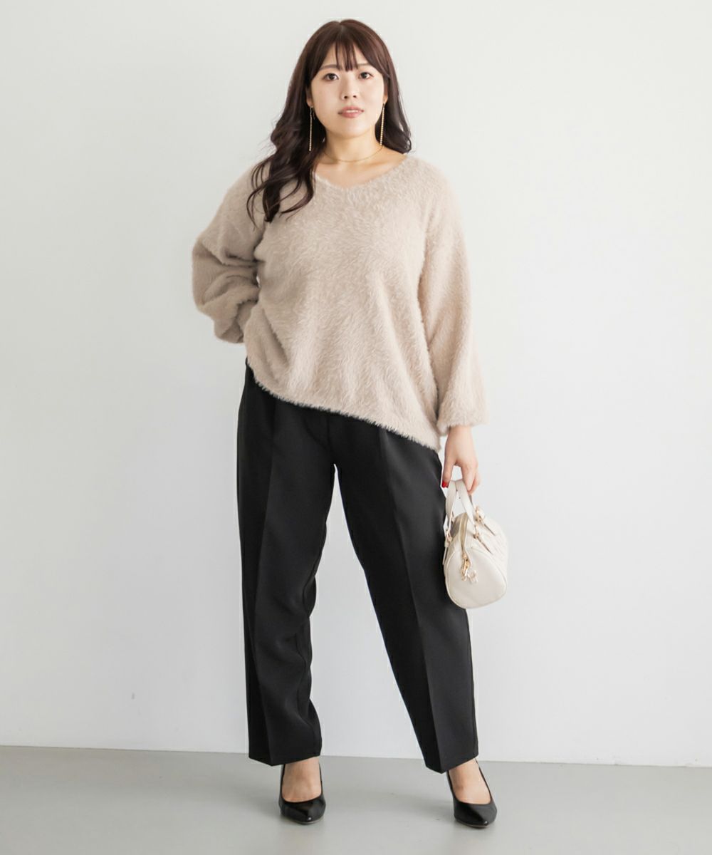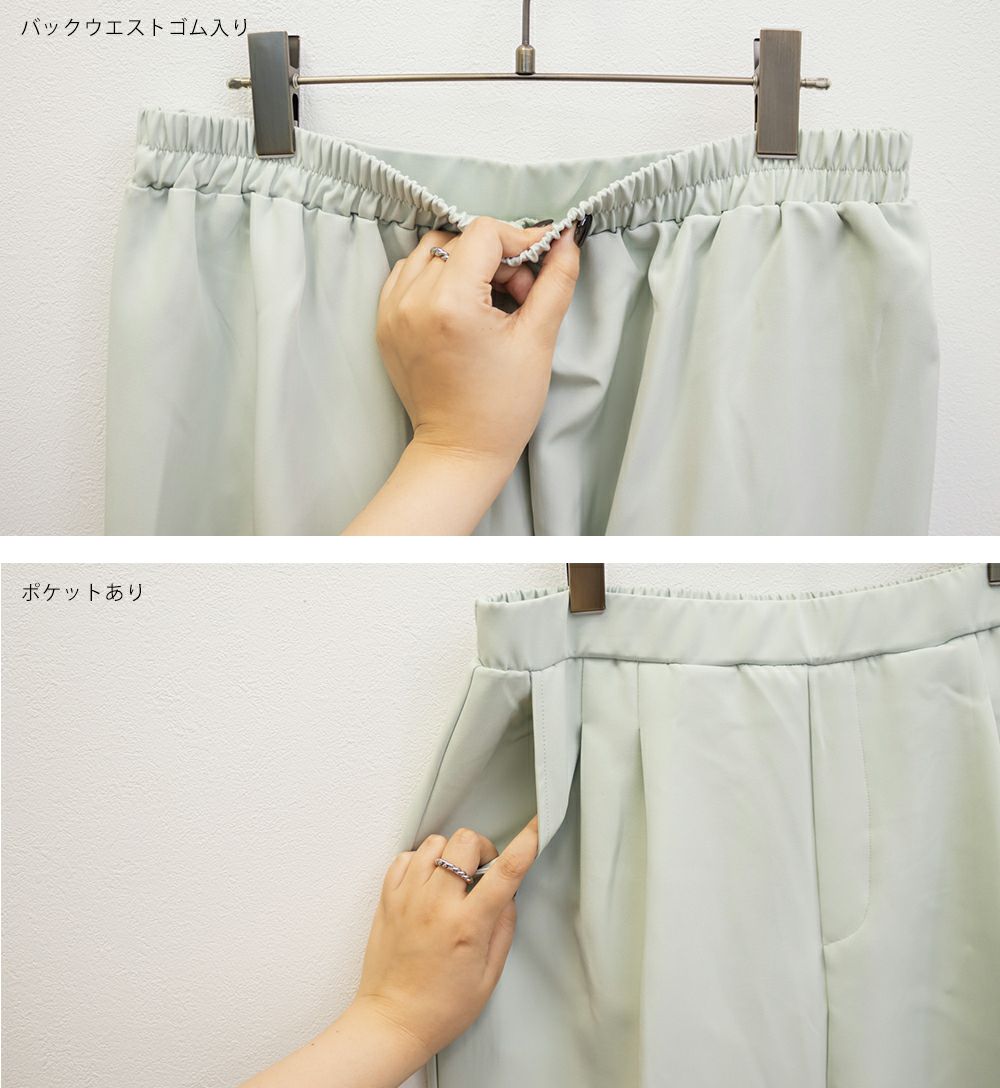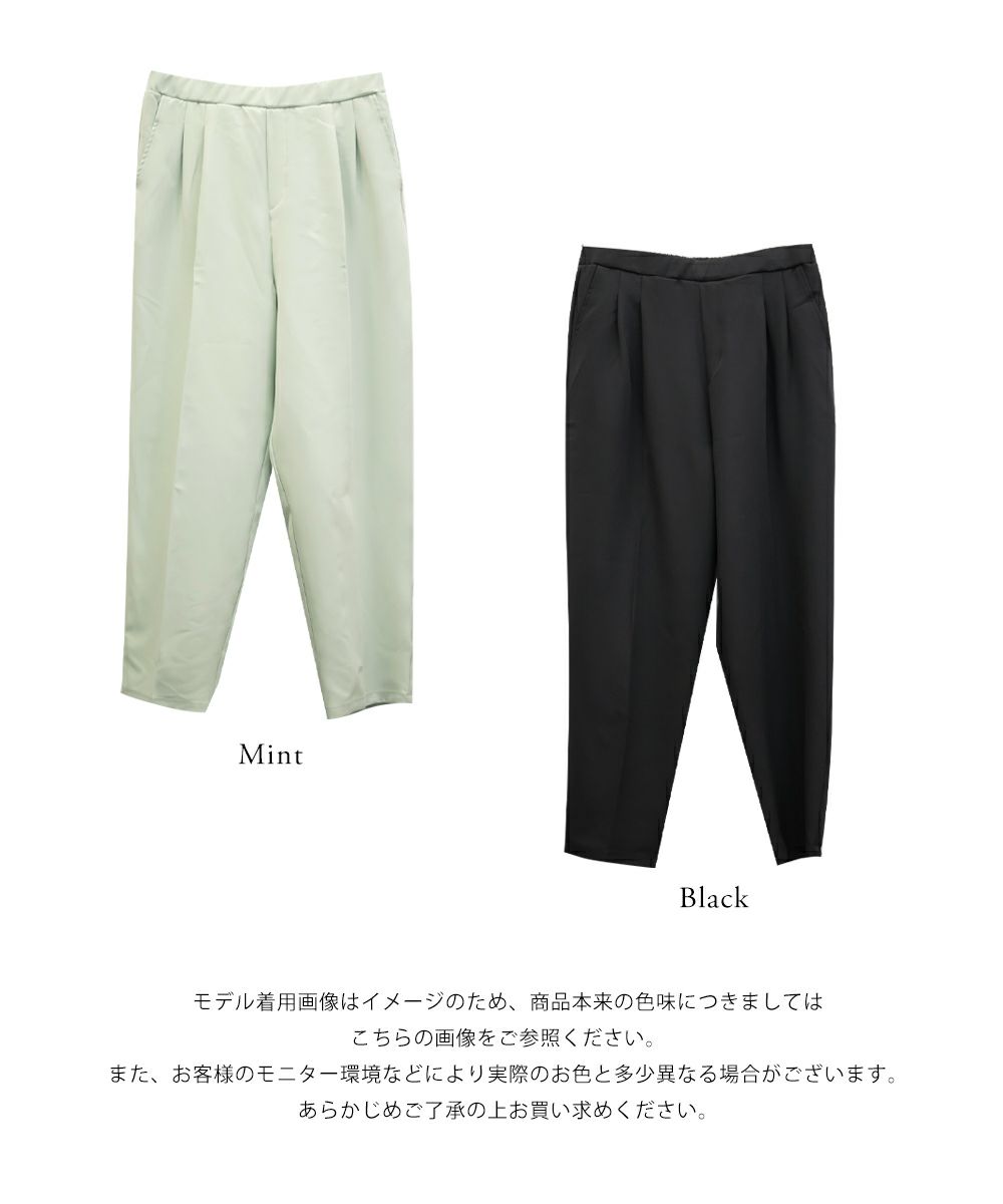 3Lサイズを着用してちょうどいい着心地でした!足元に向かってすっきり細くなるテーパードシルエットで美脚効果のある1枚です◎後ろウエストゴム仕様で窮屈感のない着心地で、さらりとした程よくしっかりとした生地なのでオールシーズン着まわせます!普段使いはもちろん、お仕事や綺麗目な服装が必要なシーンでも活躍しそうです♪
