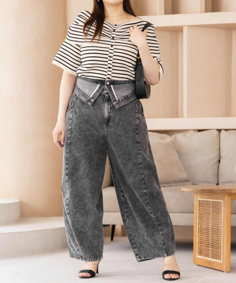 3Lサイズを着用して、ラクに動けました!ダブルウエストデザインが程よくお腹まわりをカバーしてくれて、インスタイルでおしゃれ見えします♪ハイウエストでかなりスタイルアップして見えて、トップスインとの相性も抜群です!もちろんインせずに着ても可愛いデニムシルエット・カラーなので着回し力も高いです。脚のラインを拾わないカーブ感で、簡単に今っぽい雰囲気になれる1本です!