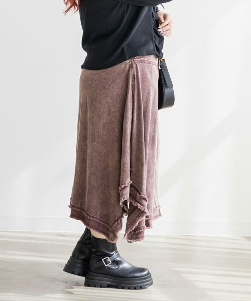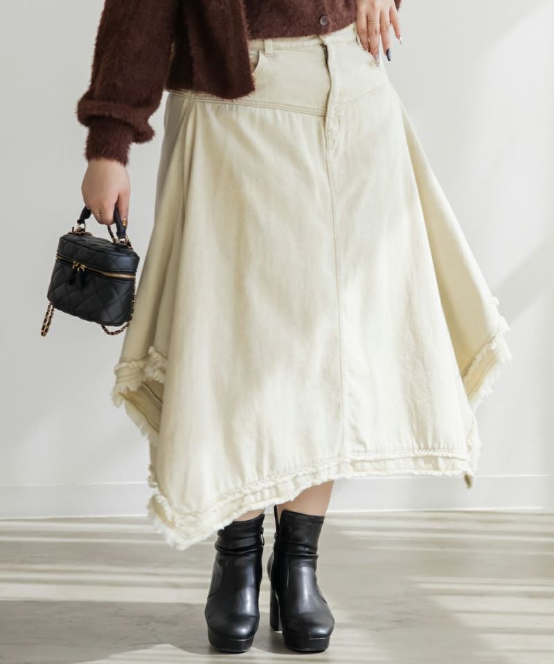 3Lを着てピッタリのサイズ感でした。ウエストは後ろゴム仕様で穿き心地もラクです。生地にほどよいハリがあるので体のラインを拾わず、すっきりとしたシルエットで着られました。フリンジデザインが目を引くおしゃれなスカートで、裾のイレヘムデザインが動くたびに軽やかで、シンプルなトップスを合わせるだけでもコーデが決まります◎ 丈感もミディ丈でバランスが取りやすく、ブーツにもパンプスにも合う1枚です♪
