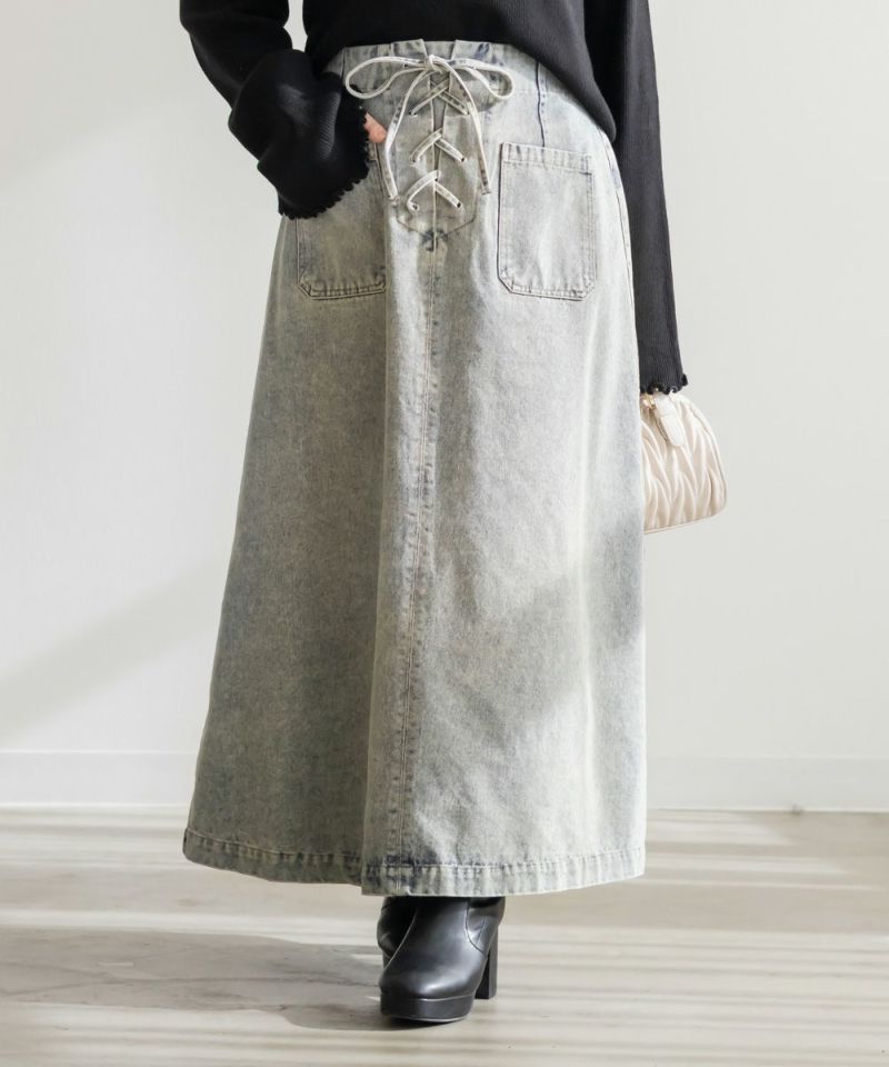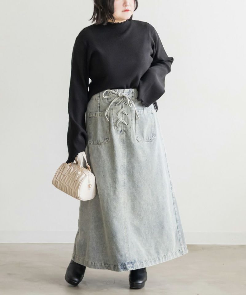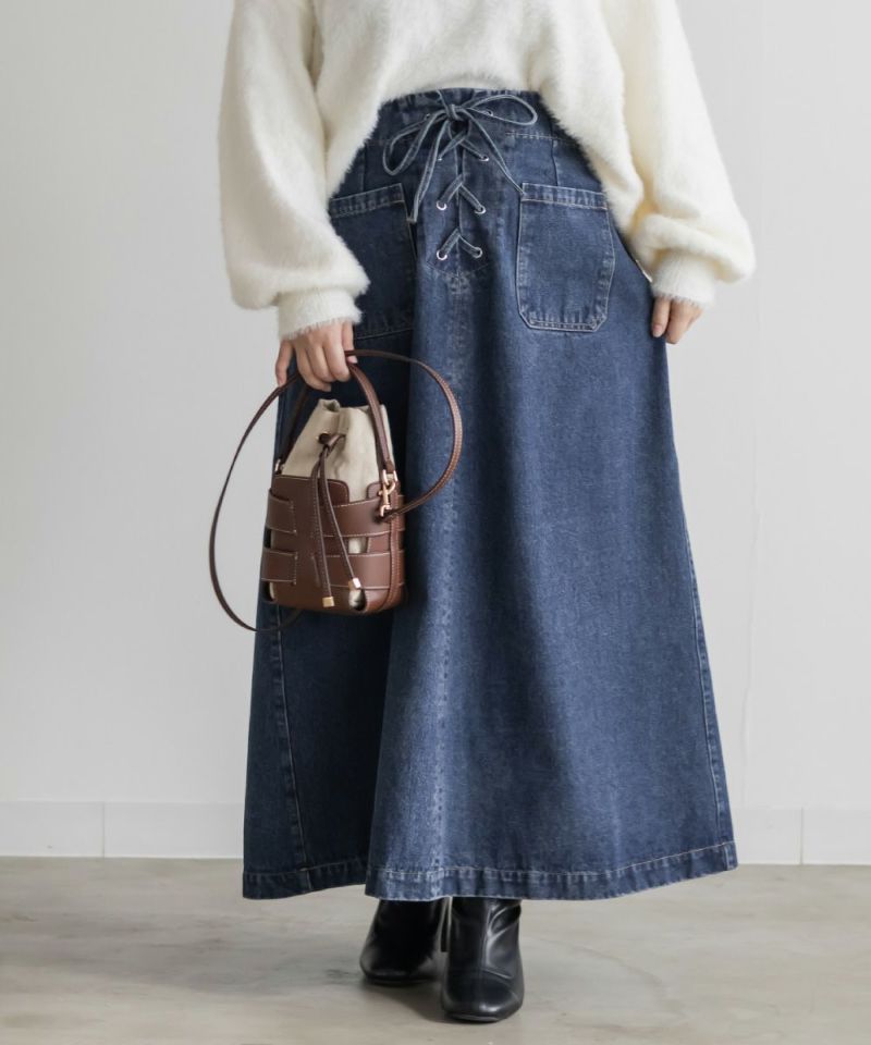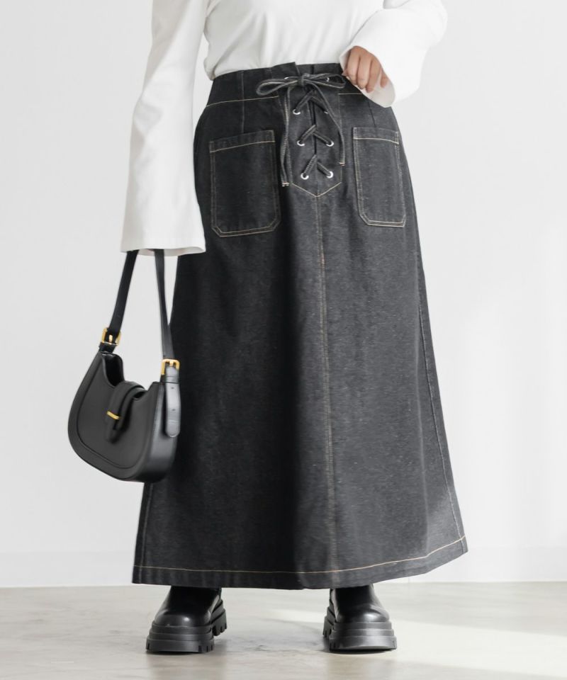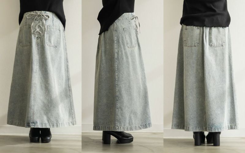 【design】シンプルな中に女性らしさをを取り入れたフロントデザイン。レースアップとポケットがポイントになってお腹まわりをカバーしてくれる。大人っぽくスタイルアップが叶うAラインシルエット。【material】しっかりとしたデニム生地で、サックスとブルーはビンテージ調の洗い加工、ブラックは落ち着いた雰囲気のカラーで仕上げました。程よくハリのある生地だから、ボディラインも拾いづらく、オールシーズン着用可能です。【styling】シンプルなシルエットだからシャツ・ニット・カットソー,どんなトップスとも合わせやすい。コーデの主役になれるようなデザイン性のあるスカートだから、ベーシックなトップスを着てもこなれ感のある着こなしに。