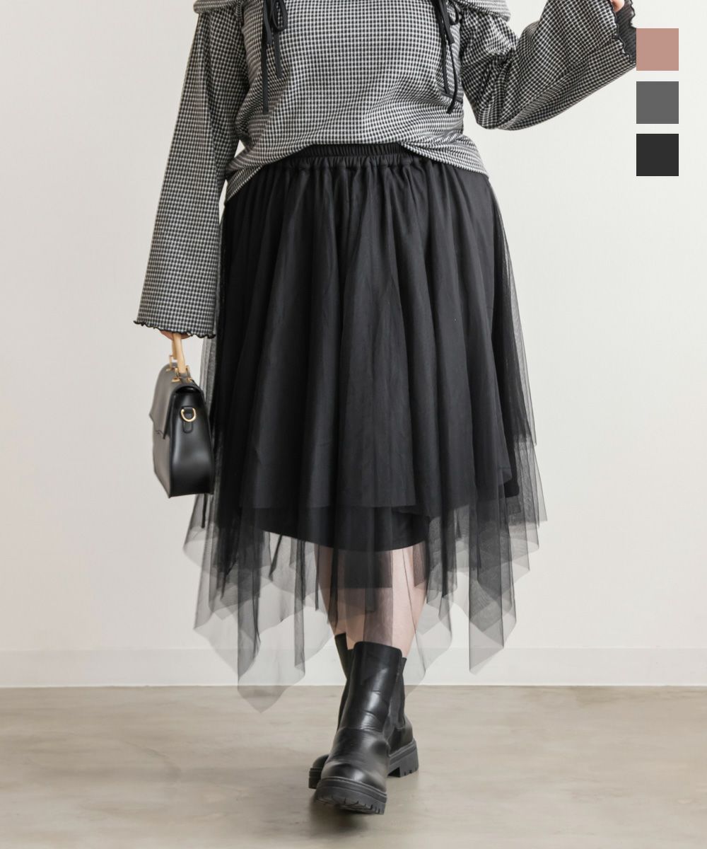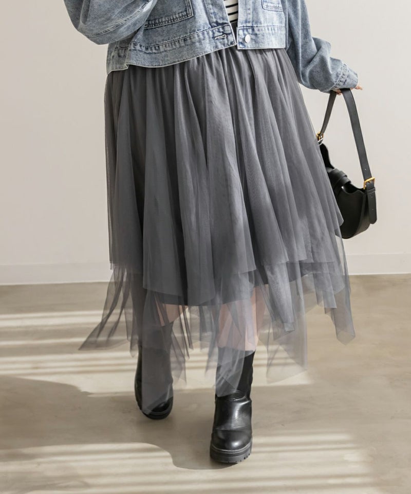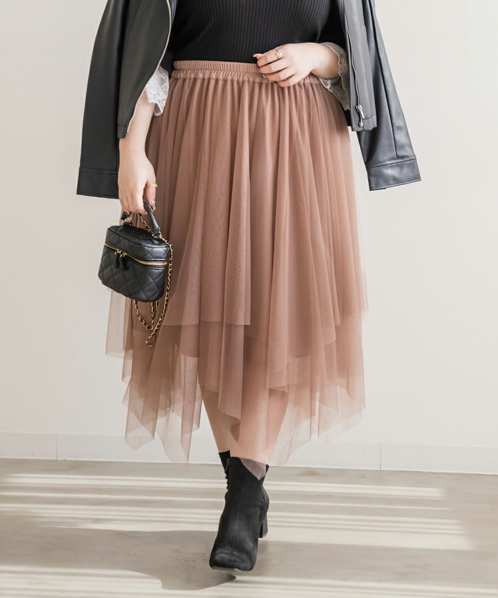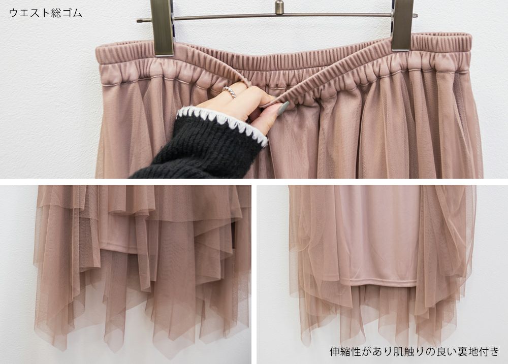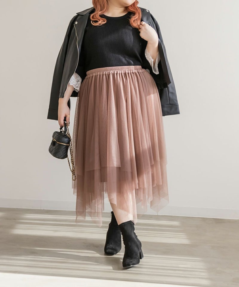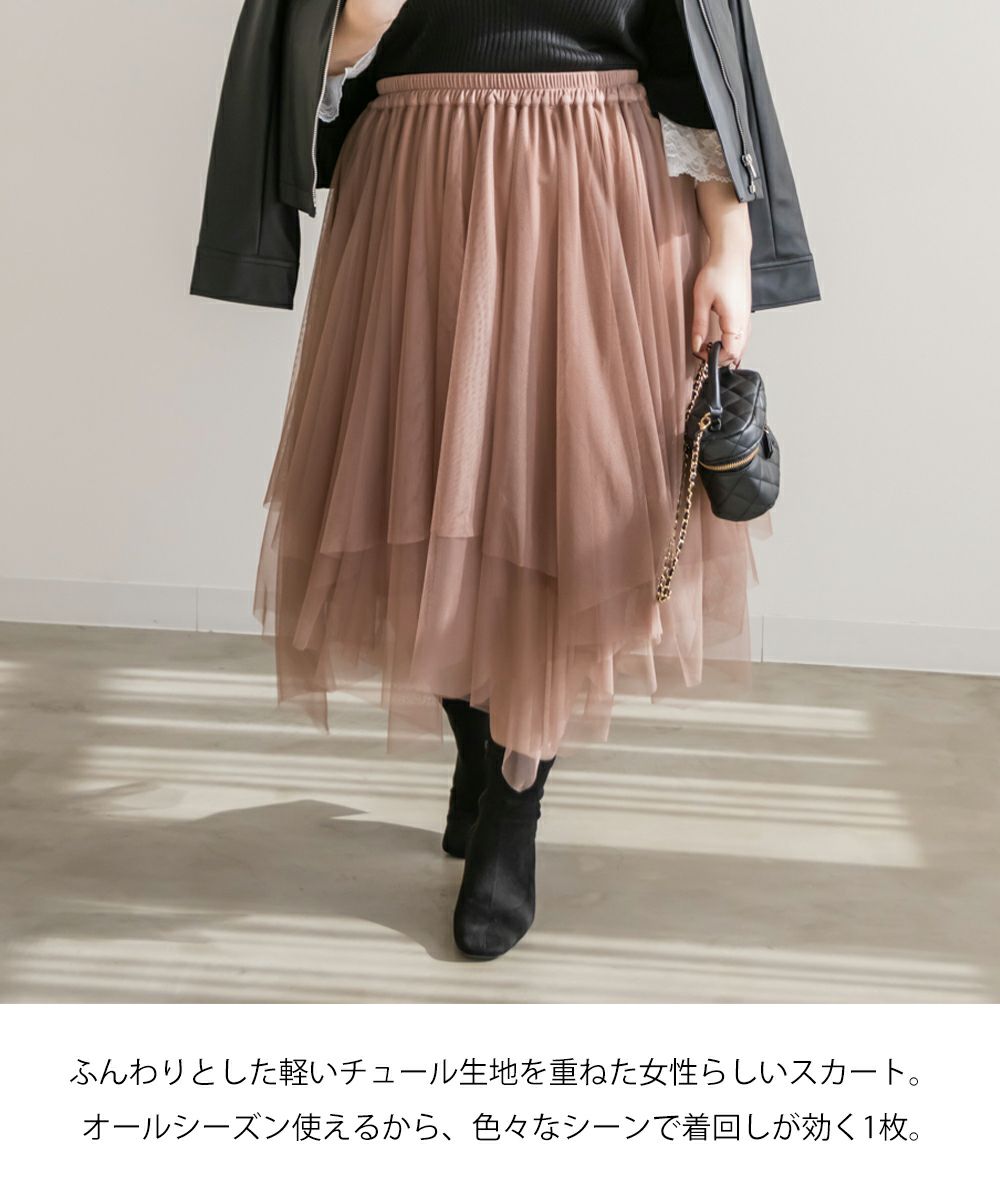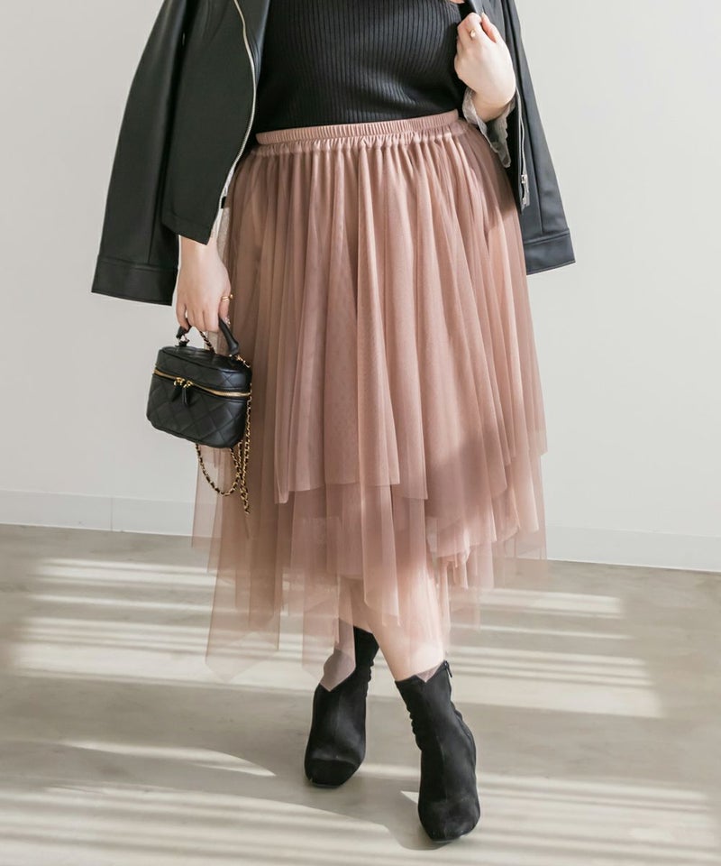 3Lサイズを着用してちょうどいいサイズ感で着用出来ました!ウエストは総ゴムで着脱も楽々です!ひらひら広がりのあるチュールスカートで足さばきもしやすいのがうれしいです♪ランダムなチュールティアードがコーディネートを華やかにしてくれるアイテムです!着丈も長すぎないので、ショートブーツをチラッと見せる着こなしもお勧めです。