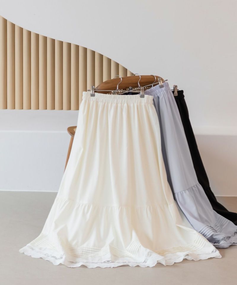 LLサイズをきてらくちんな着心地でした。ウエストは総ゴムで、ほどよくフィットしながらラクに履けて動きやすいです◎程よく落ち感のある生地で広がりすぎず、綺麗なフレアシルエットです!裾のピンタックとレースがとっても上品で、フェミニンな着こなしももちろん、カジュアルコーデでも大人っぽくまとまります♪ブラウスと合わせればきれいめに、ロゴTと合わせれば抜け感のある可愛さも楽しめて、着回し力もばっちりです!年中使える生地感・デザインなので、たくさん着回したいアイテムです!