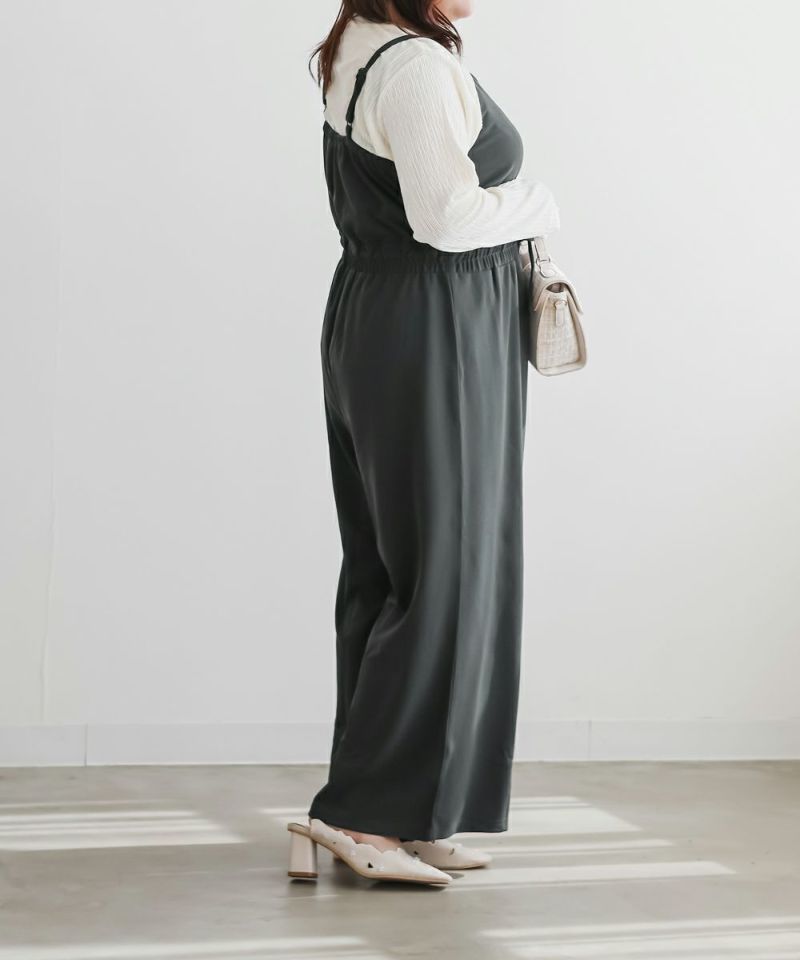 3Lサイズを着用して、ゆとりのあるサイズ感でした。3Lのサイズ感です。とってもらくちんなのに、すっきり細見えできるサロペットです!インナー次第でオールシーズン着用できる着心地で着回しがたくさんできそう◎さらっと着こなして大人っぽくこなれ感のある雰囲気になれる1枚です。