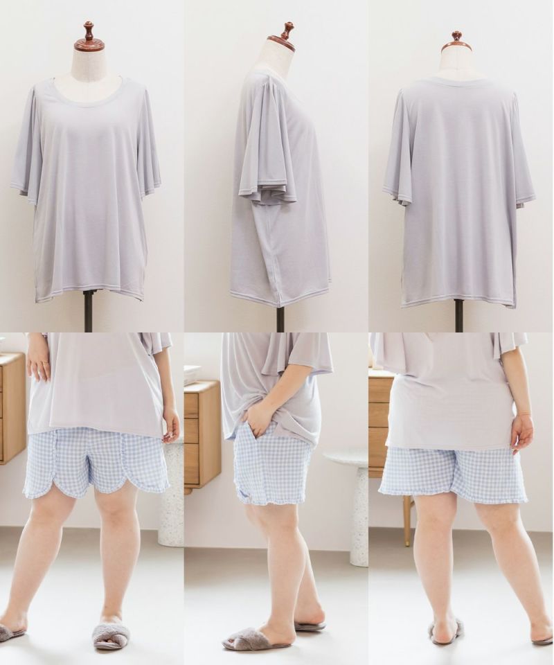 3Lサイズを着用してちょうどいいサイズ感でした。いつも通りのサイズ選びで問題なさそうです。らくちんな着心地で、のんびりするのはもちろん家事もしやすいデザインです◎トップスは気になるお腹周りやおしり・太ももをすっぽり隠す着丈で、着やせするのが嬉しいです♪パンツはお家で使うのにピッタリな短めの丈で、夏も快適に過ごせそうです!セットのルームウェアなのでこれを買うだけでオシャレで可愛いおうちスタイルが完成します!
