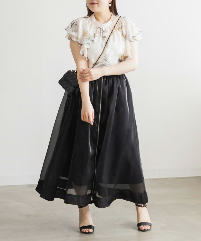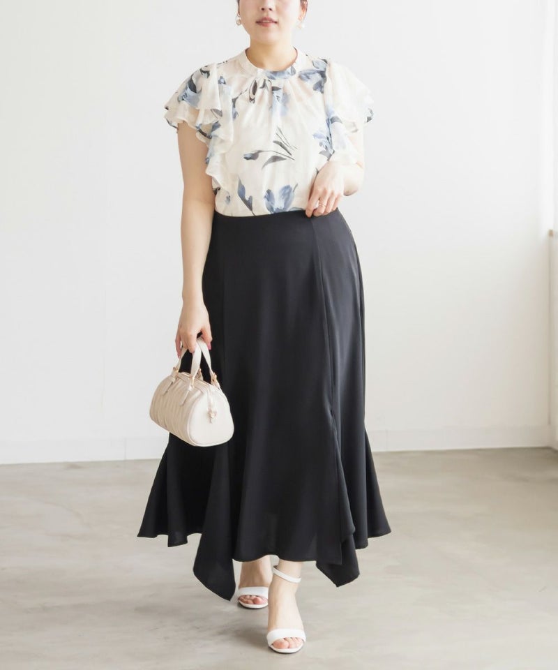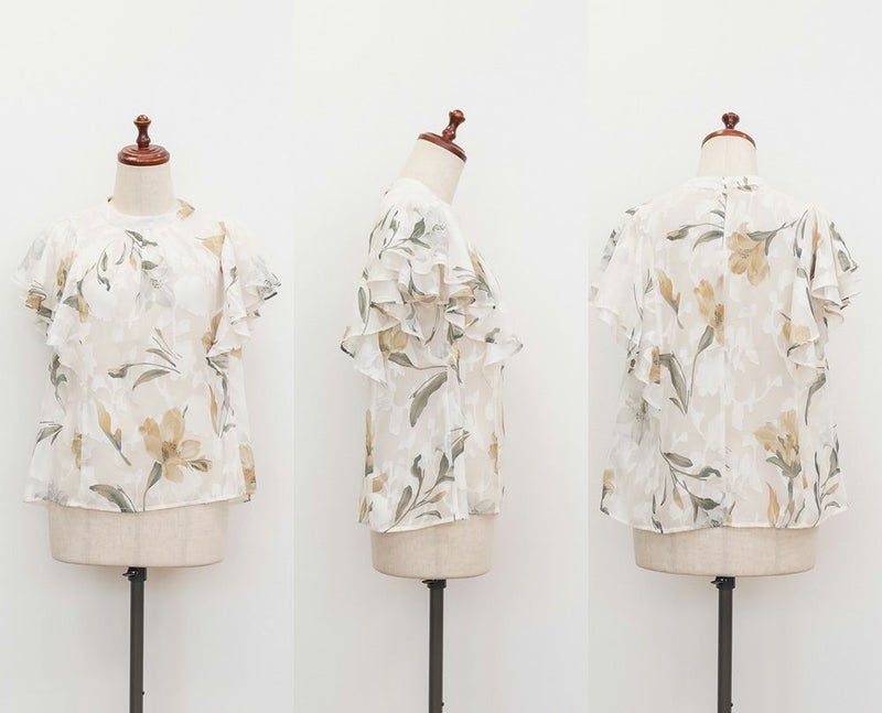 3Lサイズを着用してぴったりのサイズ感でした。伸びの無い素材なのでサイズ確認をお勧めします!後ろにボタンがついているので着脱は楽にできました!透け感のある生地と大人っぽい花柄がどんなコーデにも合わせやすいです◎フリル袖のフェミニンなデザインもフェミニンな1枚で、シンプルなスカートやあえてデニム合わせしても可愛いと思います♪キャミワンピやジャンスカなどのインナー使いも出来ちゃうので色々なコーディネートに活躍するブラウスです!