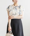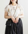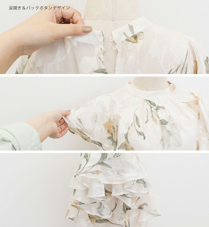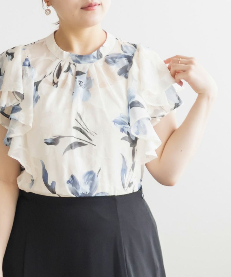 クレット 大きいサイズ フレンチスリーブ 半袖 シアーブラウス ハイネック 仕事 オフィス ハレの日 ジャガード花柄フリルブラウス